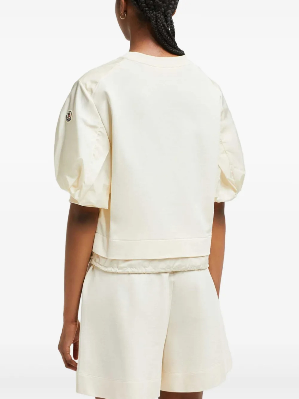 Белая аппликация с логотипом, круглый вырез, короткие рукава-фонарики, завязка на подоле