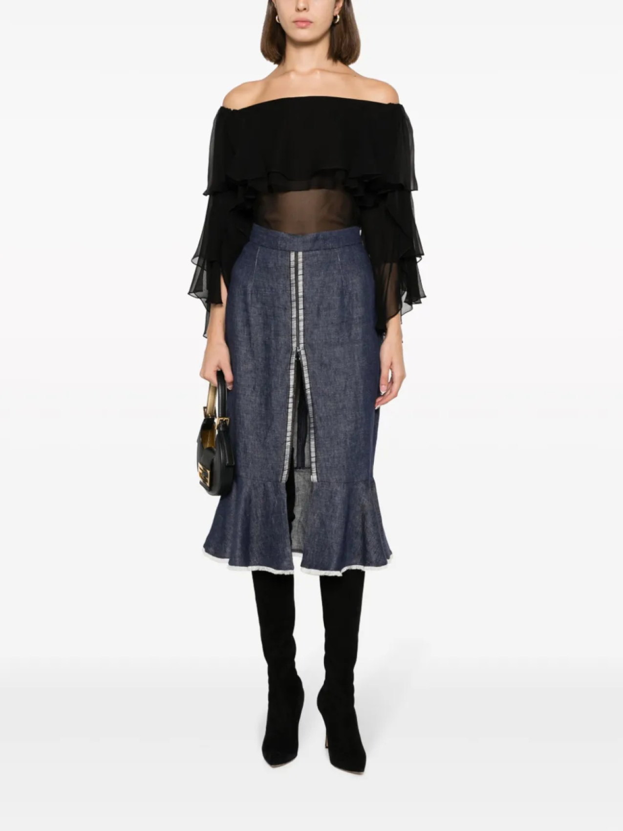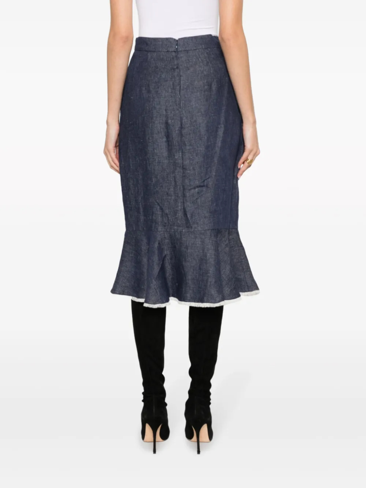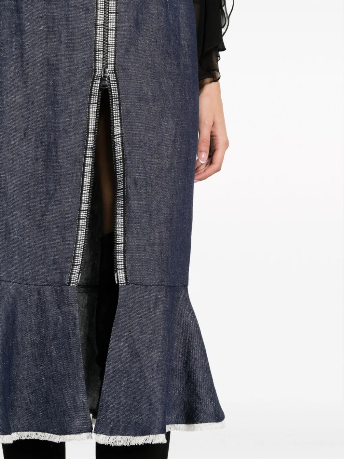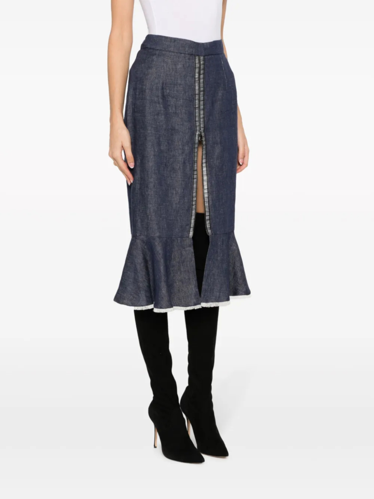 Синий, юбка-годе, деталь с молнией, необработанные края, завышенная талия, потайная застежка на молнии сзади, расклешенный подол, разрез спереди и длина ниже колена.