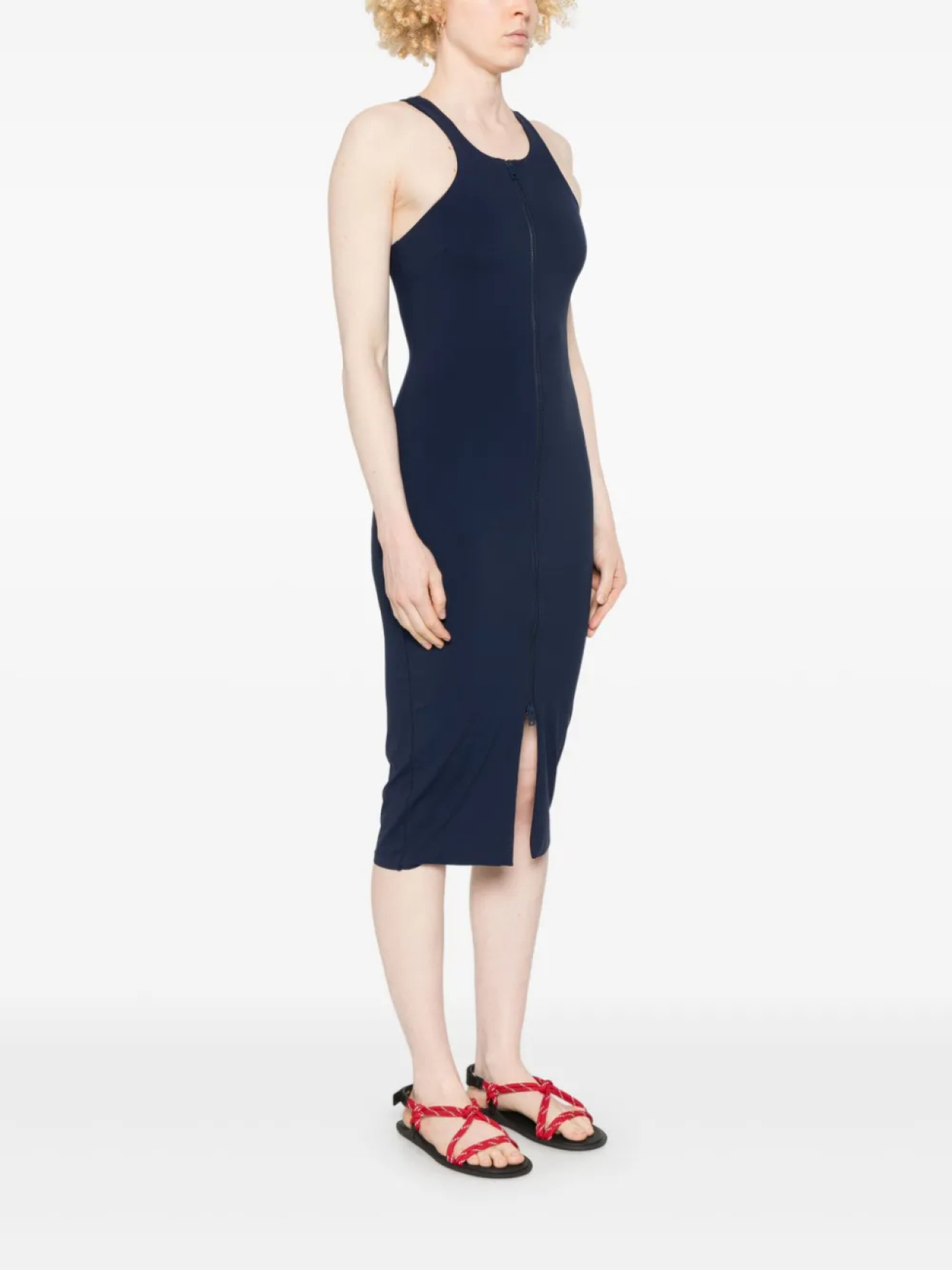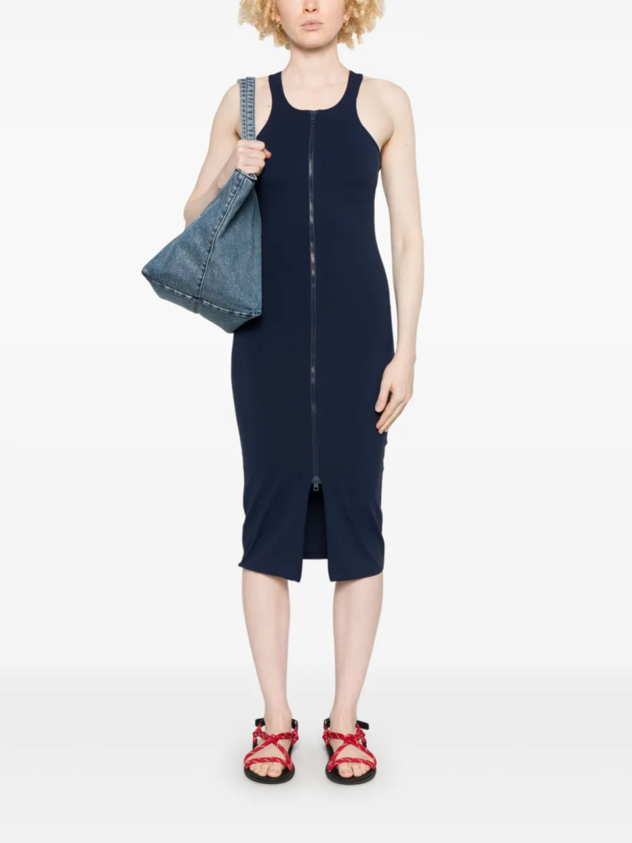 Темно-синяя застежка-молния с двумя бегунками спереди, прорезиненный логотип, круглый вырез, спина-борцовка
