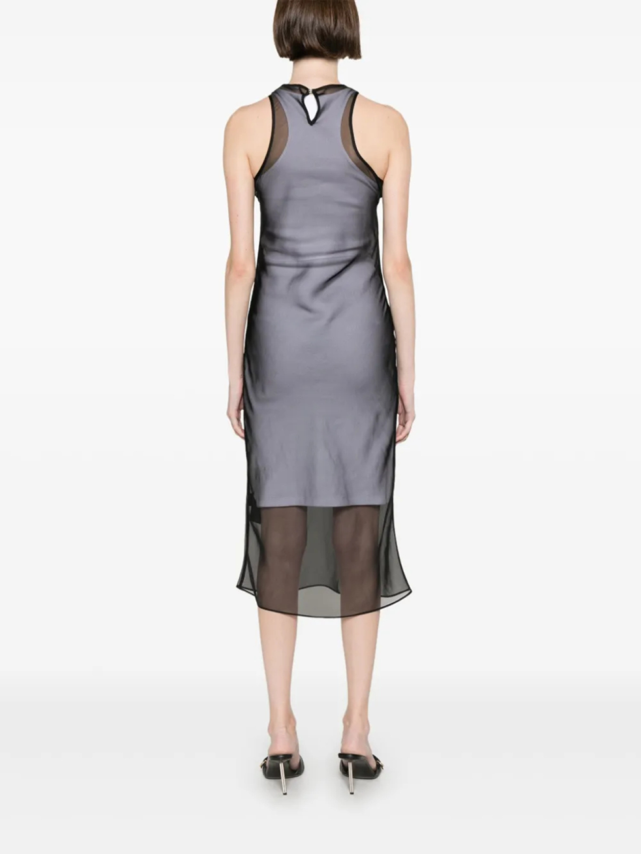 Черная застежка на одну пуговицу сзади, круглый вырез, без рукавов, полупрозрачные вставки