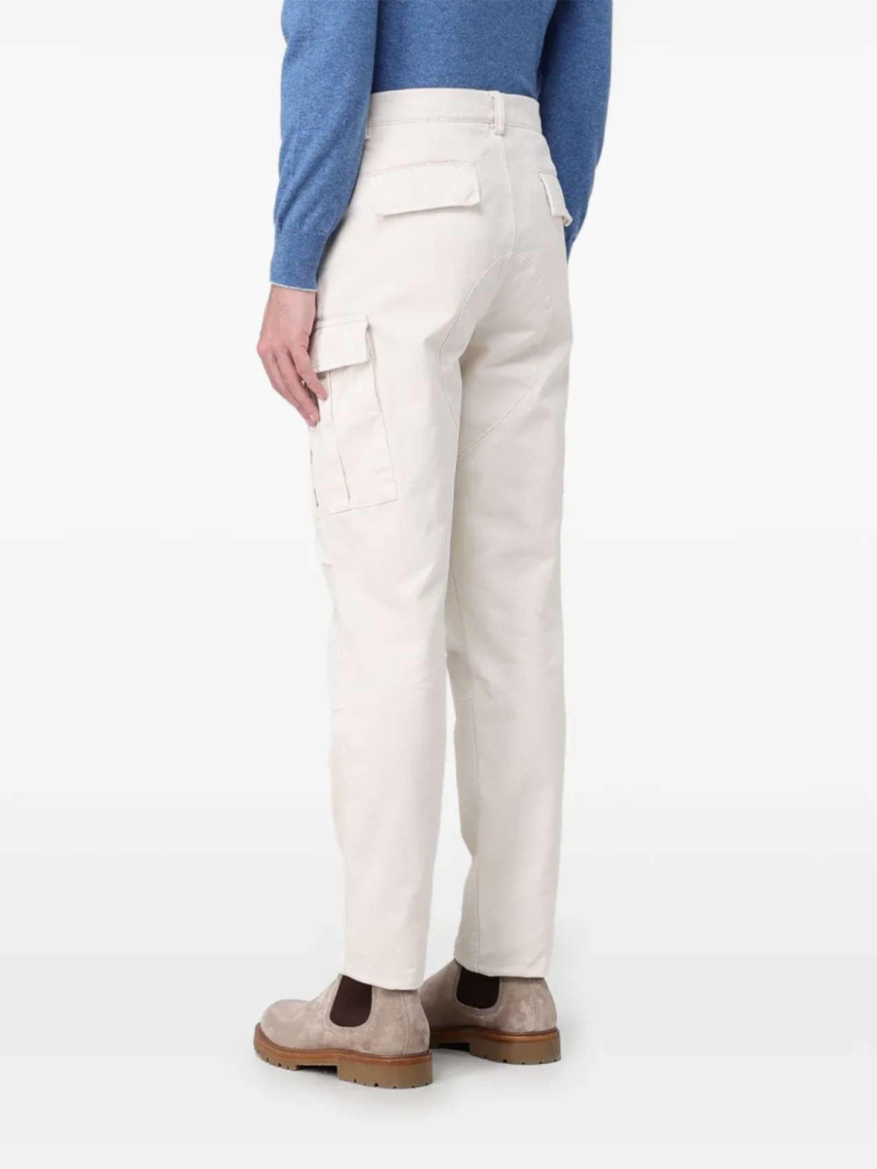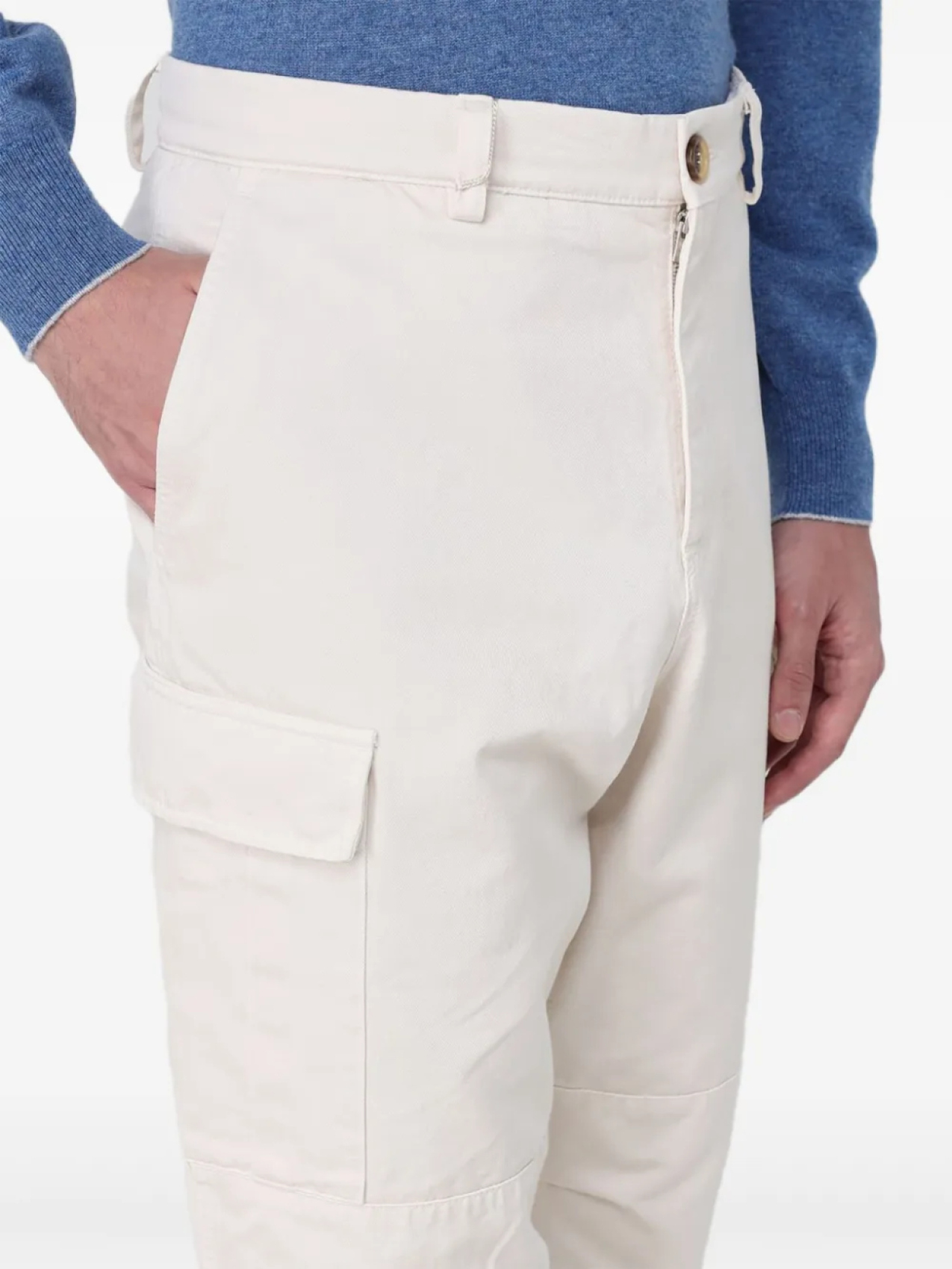 Белая потайная застежка на гульфике и пуговицах, два боковых прорезных кармана, два боковых кармана-карго, два задних кармана с клапанами