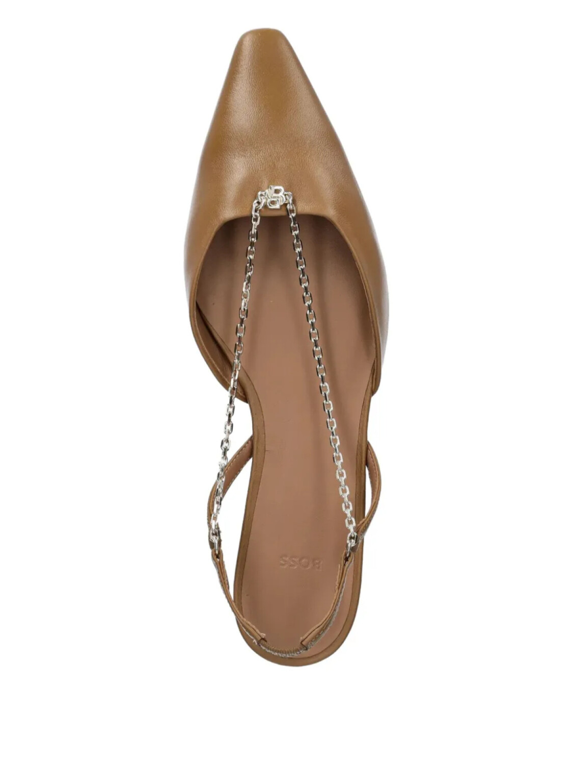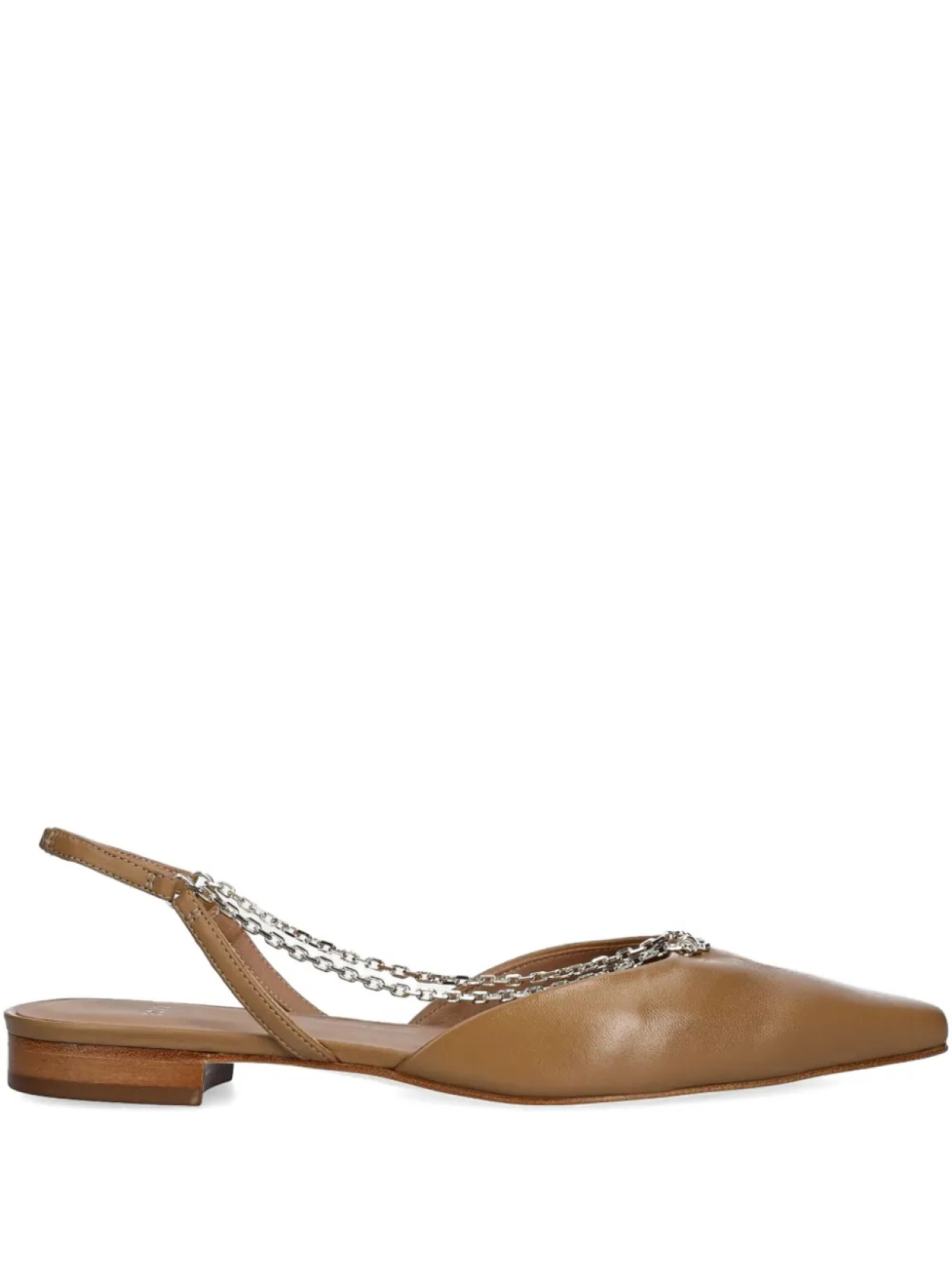 Коричневые эластичные туфли с ремешком на пятке и острым носком на низком каблуке