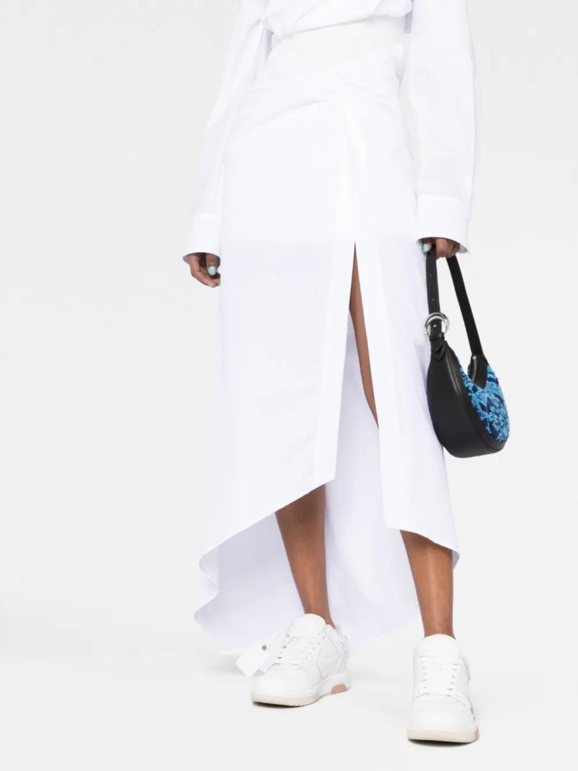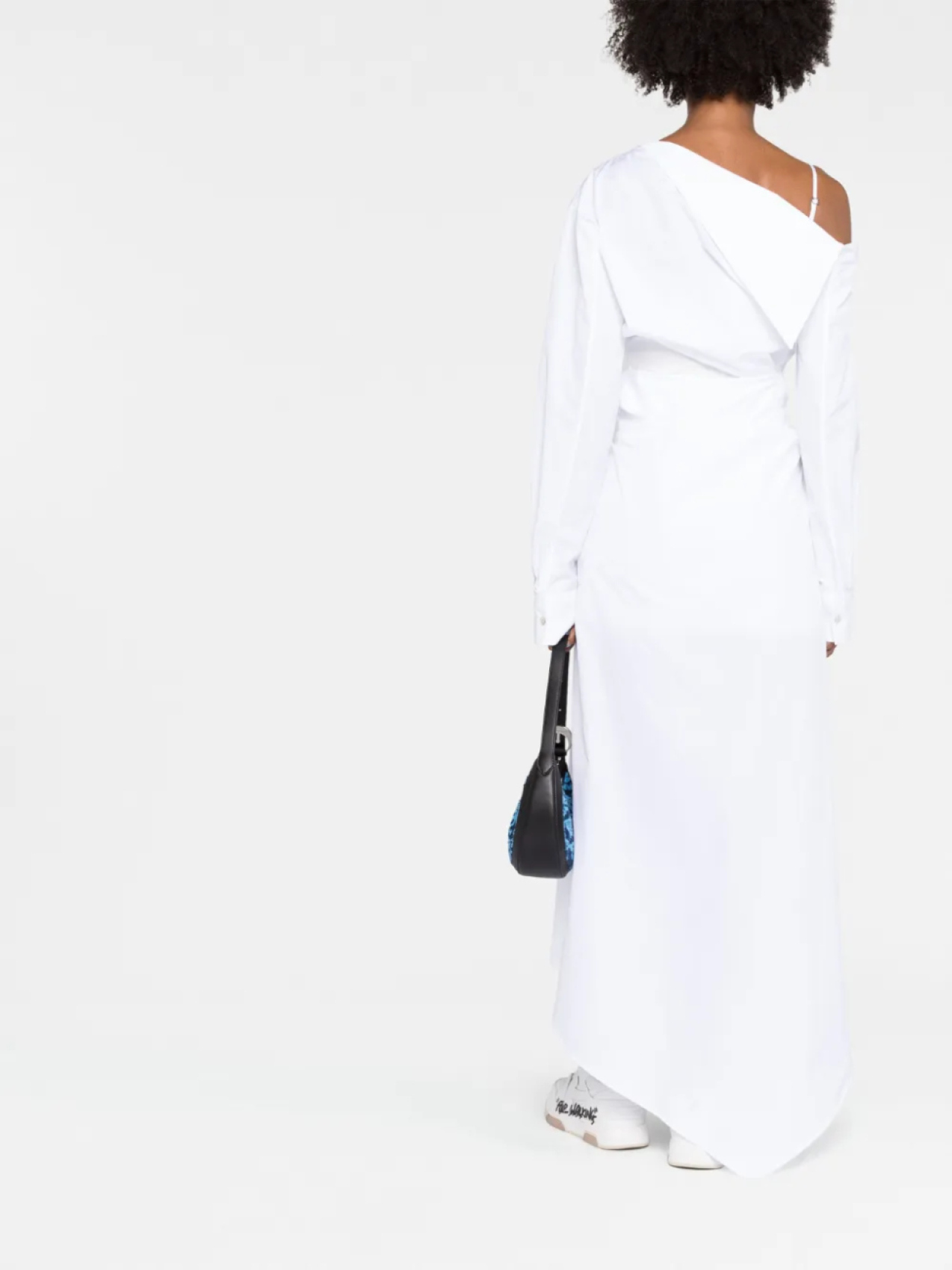Белый, хлопок, асимметричный вырез, модель на одном плече, длинные рукава, манжеты на пуговицах, драпировка, застежки на молнии сбоку, А-образный силуэт, асимметричный подол и длина миди.