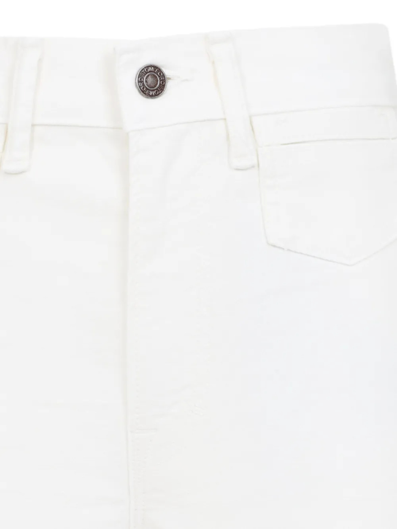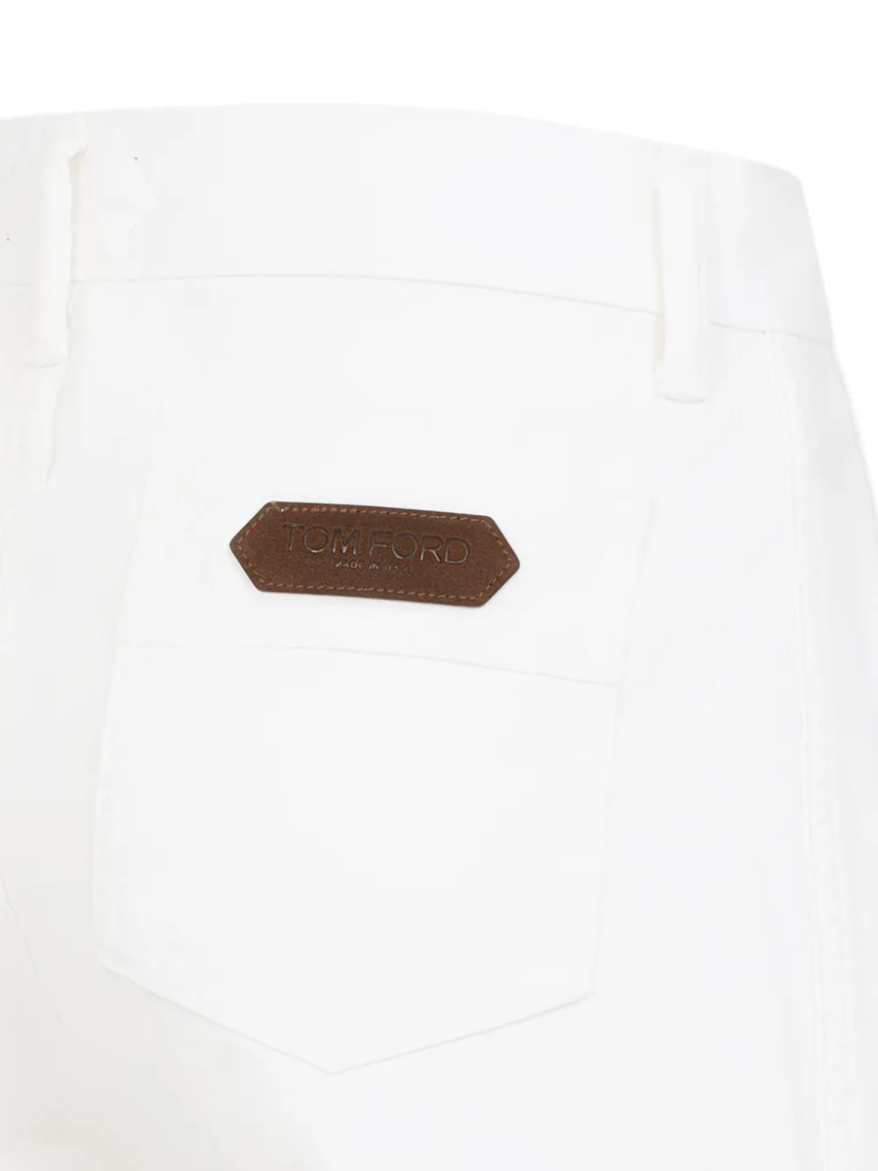 Белая застежка на пуговицу и молнию спереди, шлевки для ремня, передний карман с клапаном, задний накладной карман