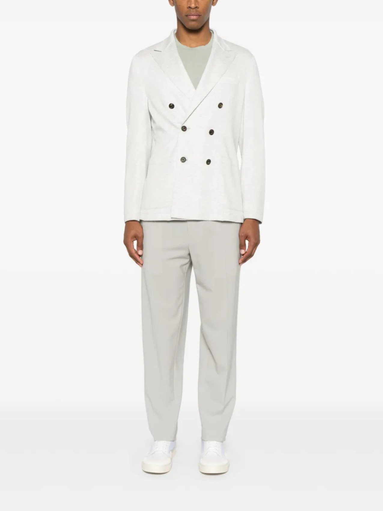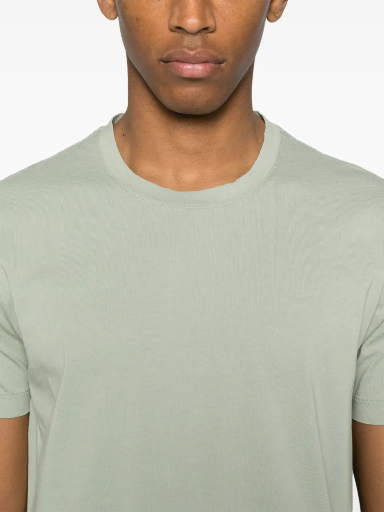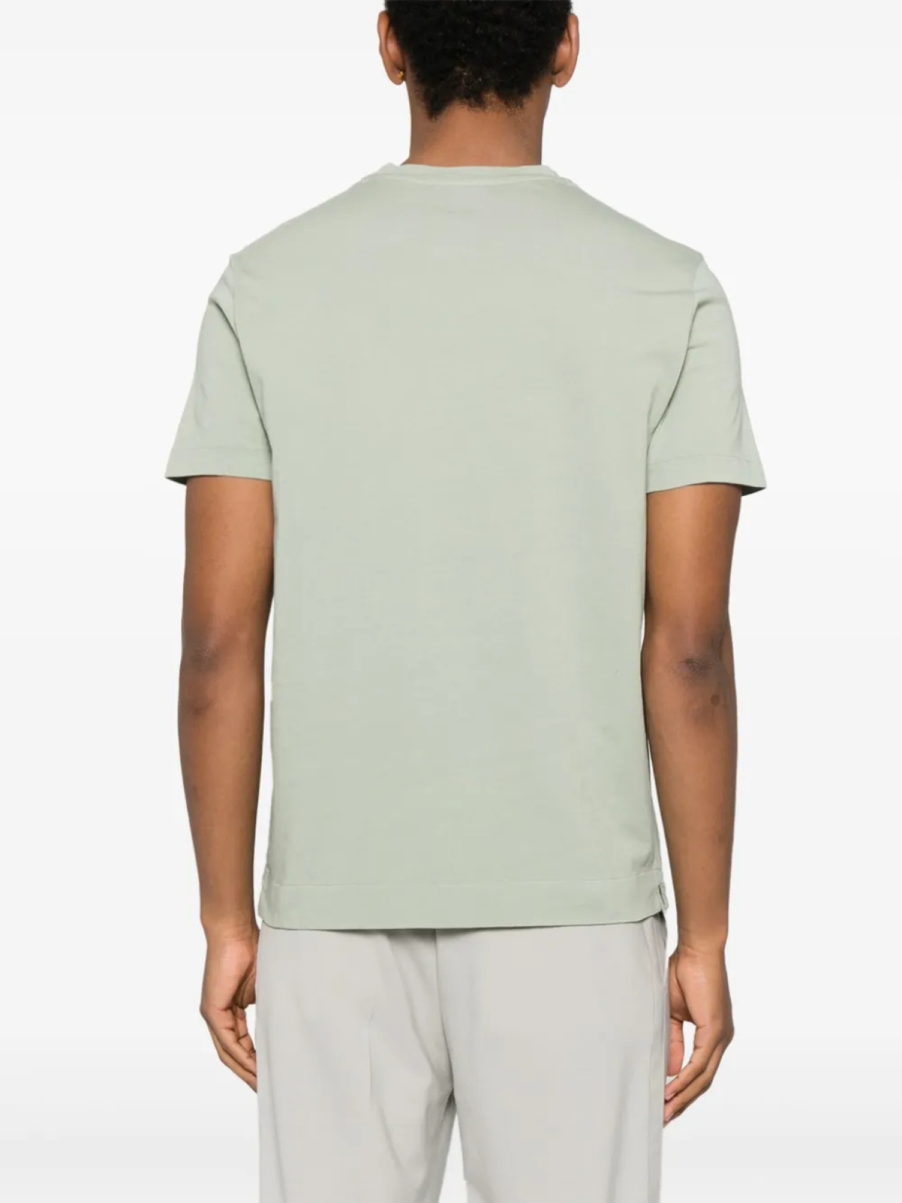 Шалфейно-зеленый, круглый вырез, короткие рукава, короткие разрезы по бокам