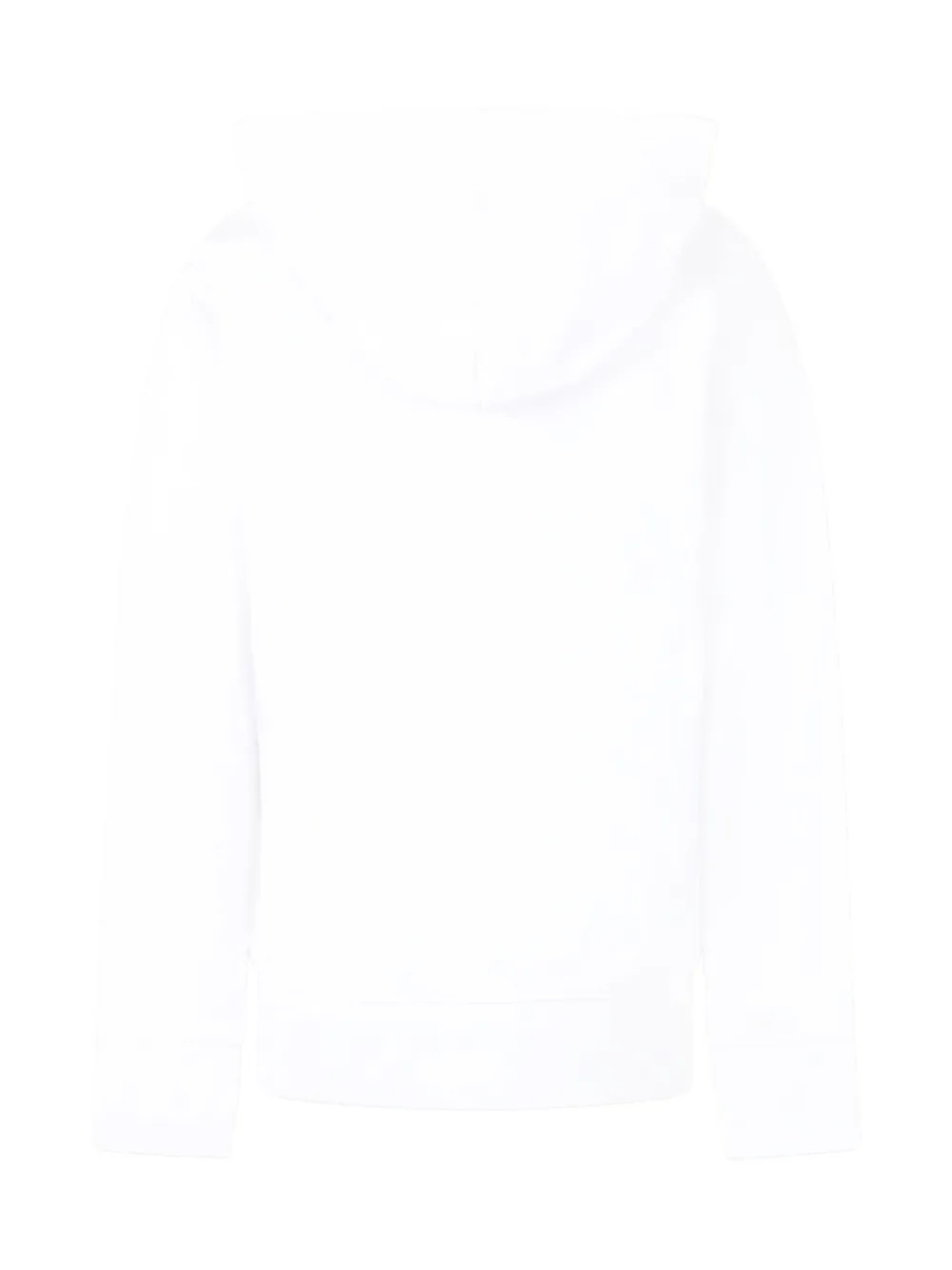 Белый объемный капюшон, вышитый логотип на груди, длинные рукава, передний карман-кенгуру