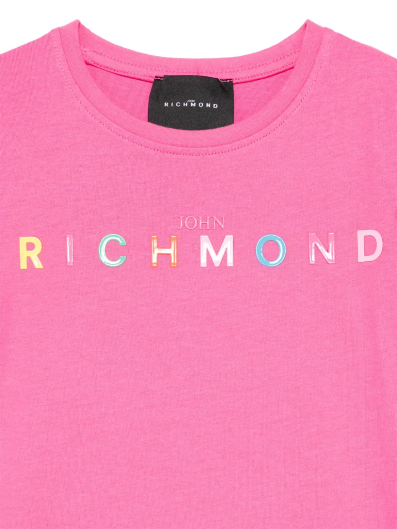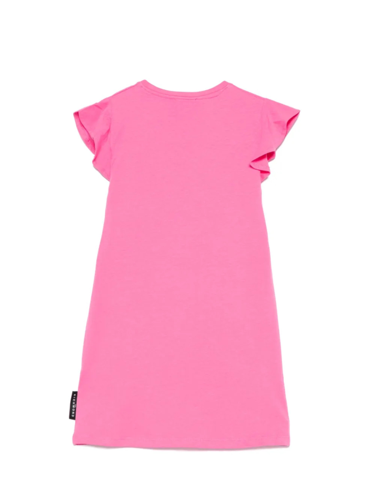 Бирка с логотипом цвета фуксии, круглый вырез, отделка оборками