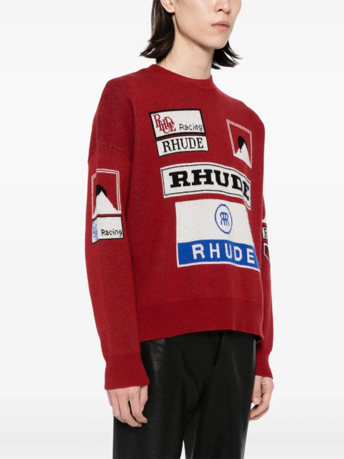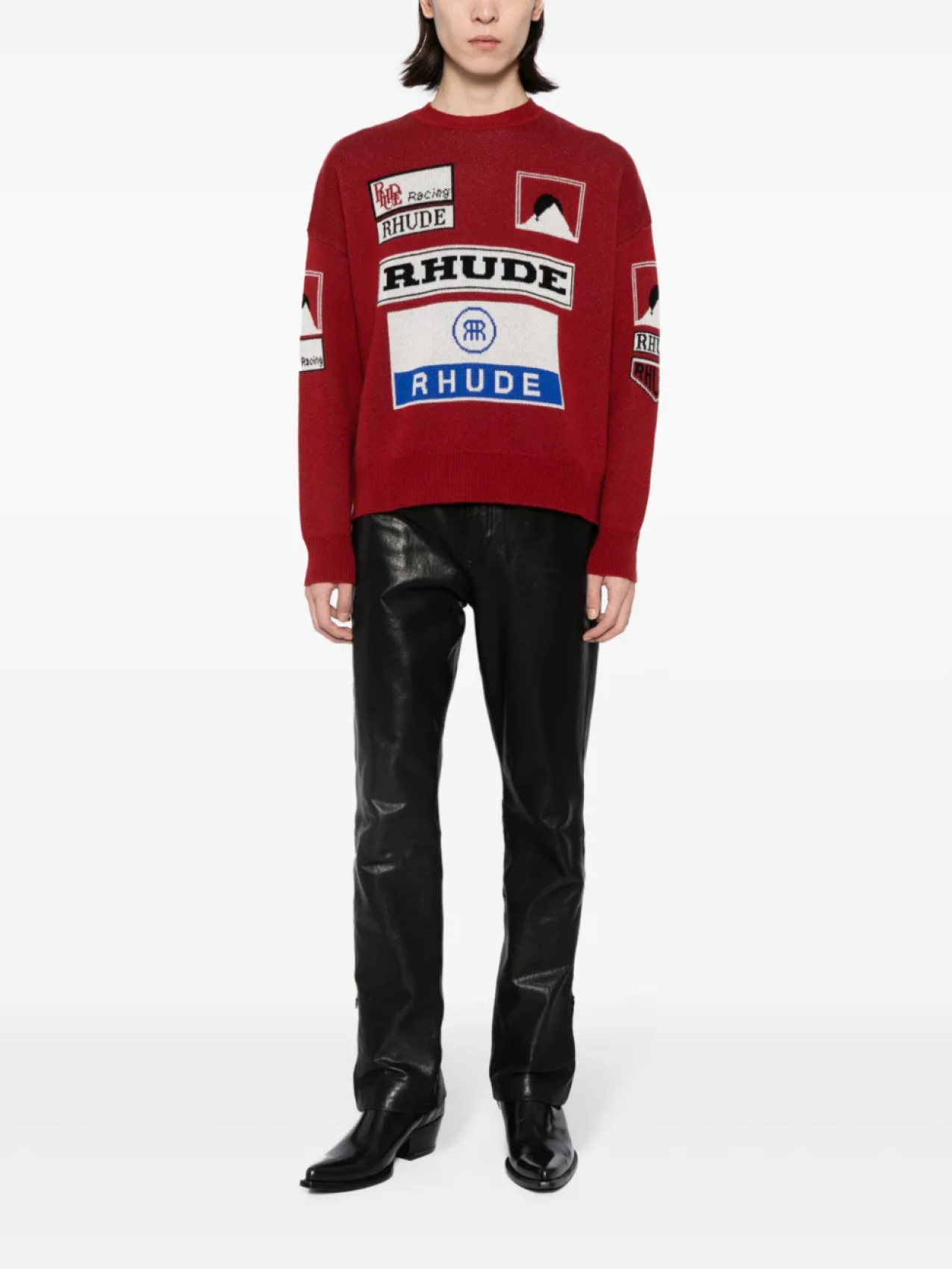Кроваво-красный, разноцветный, смесовая шерсть мериноса, смесовый кашемир, вязка в технике интарсия, вязаные края в рубчик, круглый вырез, длинные рукава и прямой подол.