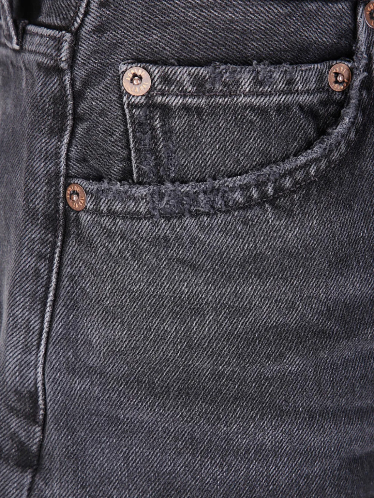 Средне-серый, застежка на пуговицы и молнию спереди, шлевки для ремня, пять классических карманов, эффект потертости на бедрах