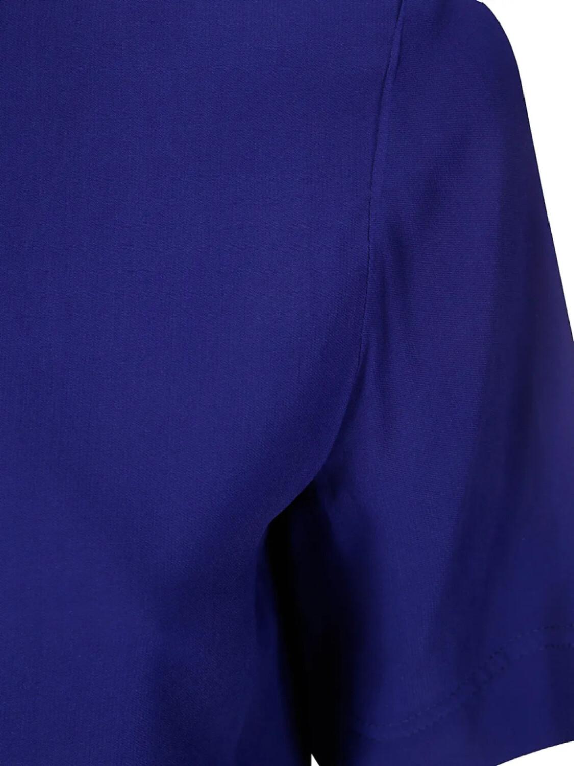 Оксфорд синего цвета, застежка на крючок сзади, круглый вырез горловины, короткие рукава, прямой подол