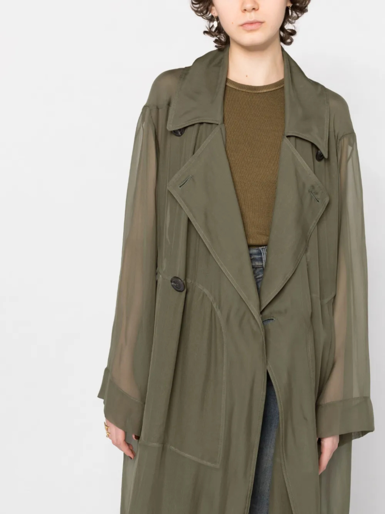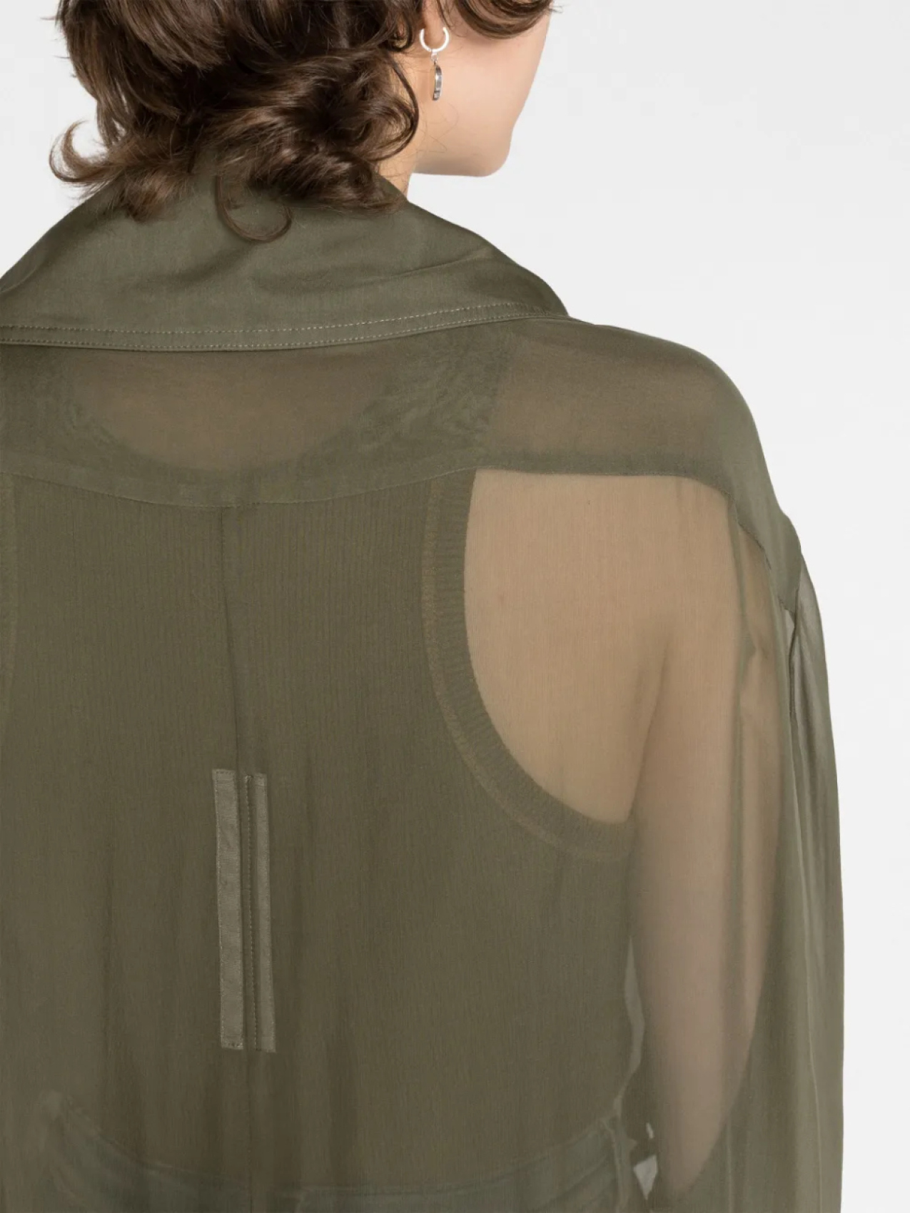 Зеленый, шелк, полупрозрачный дизайн, зазубренные лацканы, двубортная застежка на кнопки, длинные прозрачные рукава, длина по колено и прямой подол.