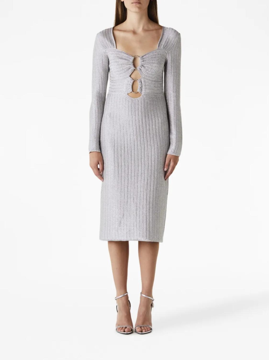 Светло-серый, хлопок, смесовая необработанная шерсть, трикотажный материал, трикотаж в рубчик, вырезные детали, квадратный вырез, длинные рукава, прямой подол и длина миди.