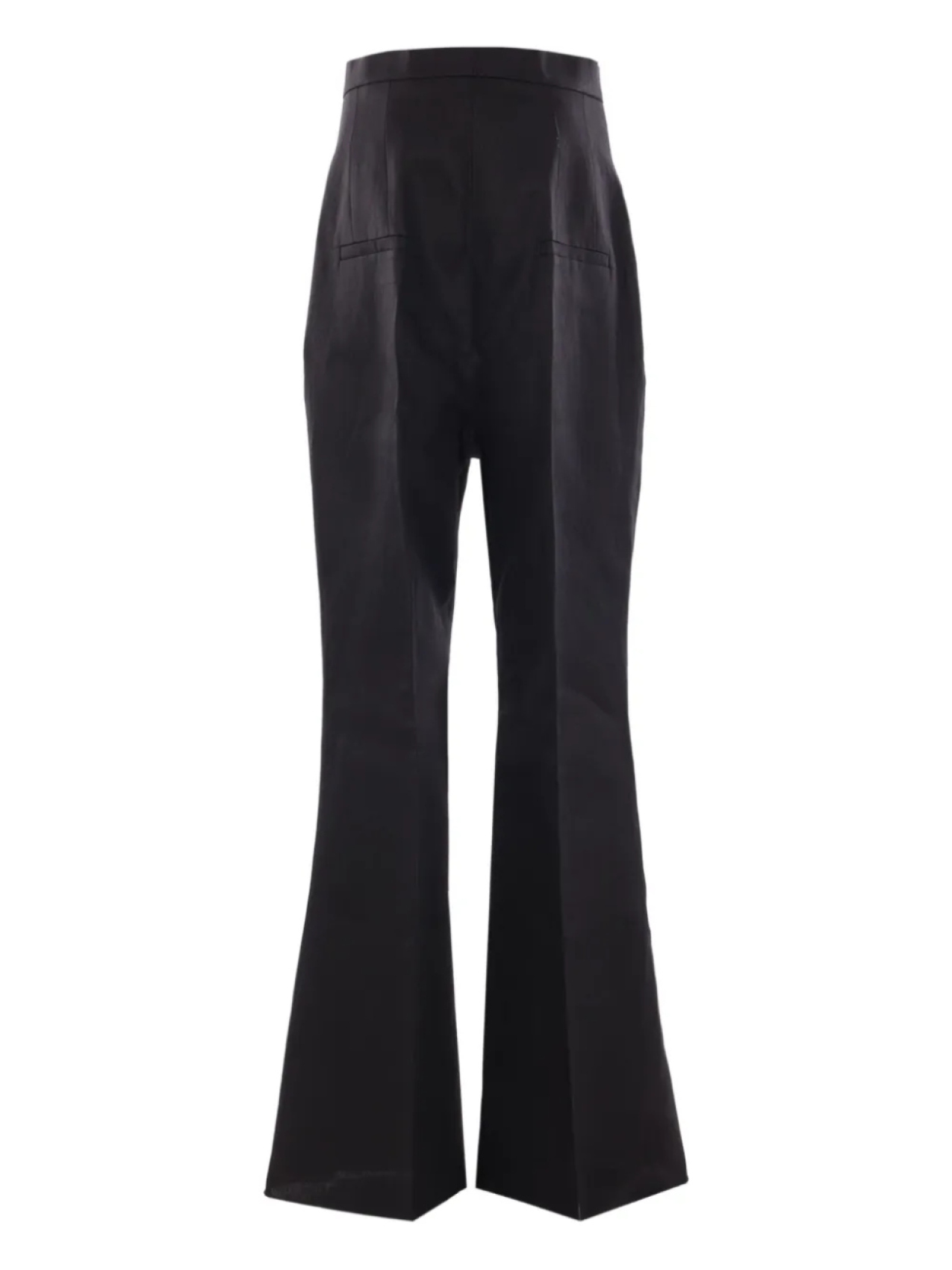 Черная потайная застежка спереди, два прорезных кармана сзади, расклешенный фасон с высокой талией