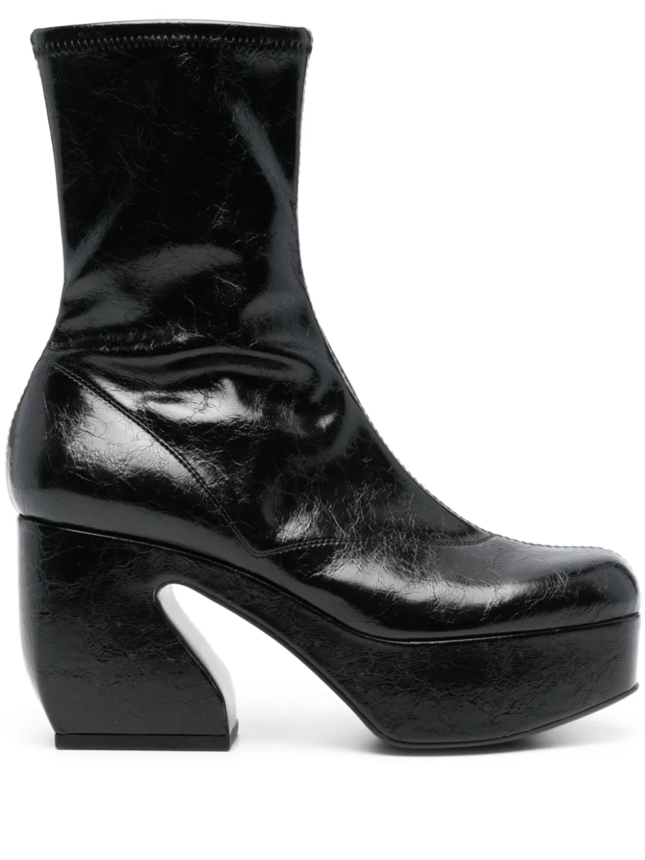 Черный, телячья кожа, зернистая текстура, короткая застежка на молнии сбоку, закругленный носок, кожаная стелька с логотипом, подошва на платформе, скульптурный каблук средней высоты и резиновая подошва.