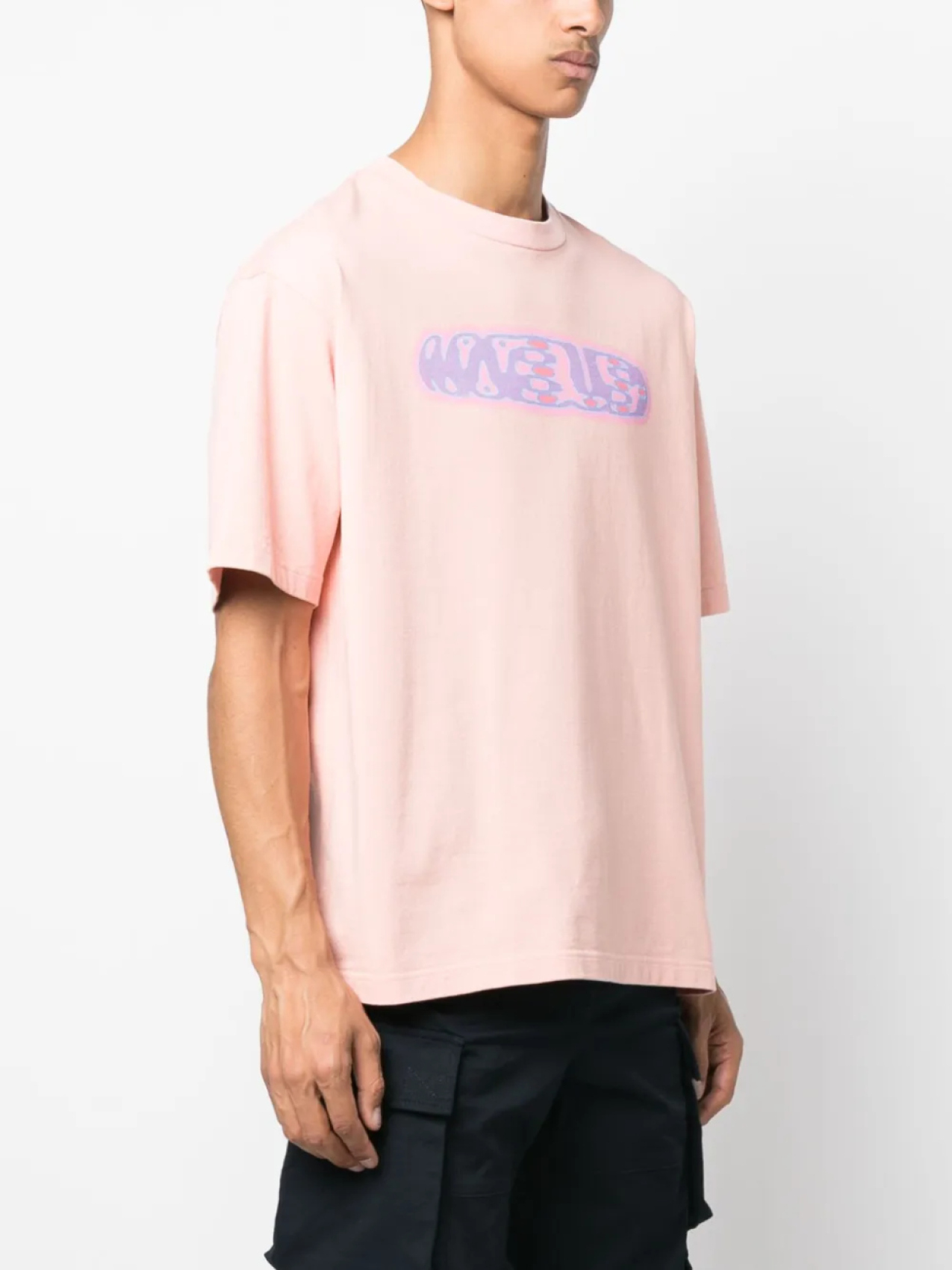 Розовый, хлопок, логотип спереди, круглый вырез и короткие рукава.