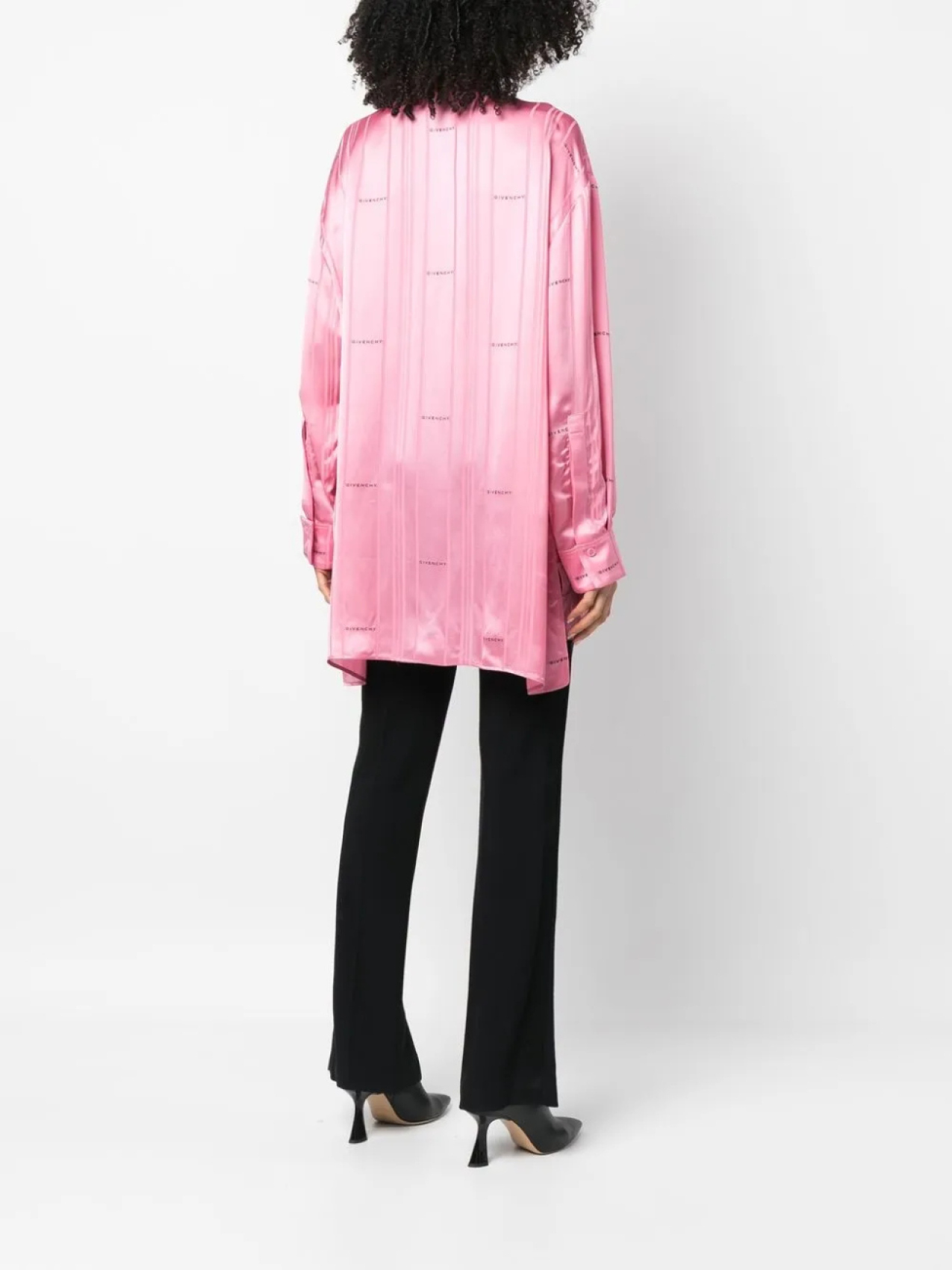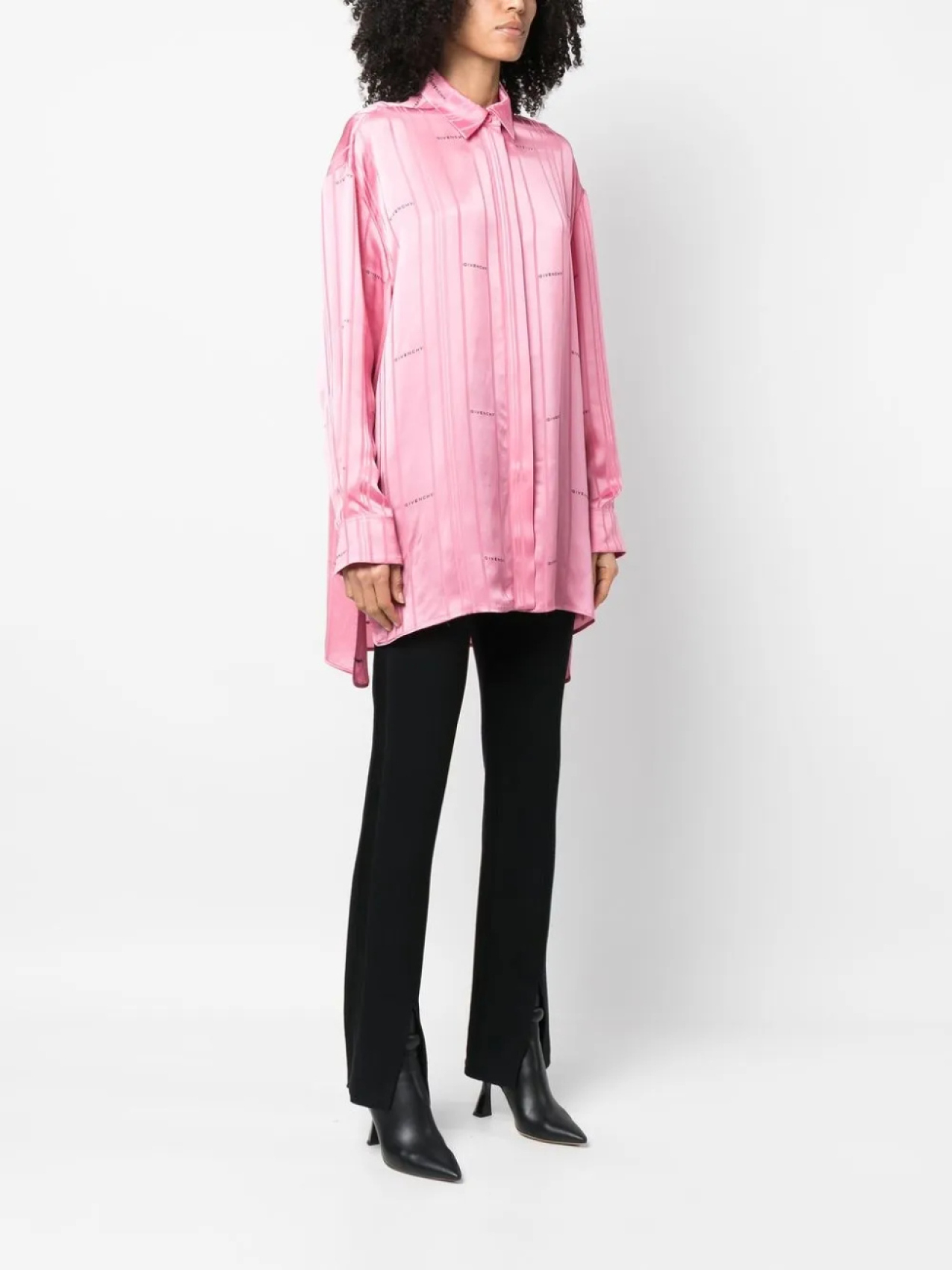 Сатиновая фактура, жаккардовый логотип, узор в вертикальную полоску, отложной воротник, потайная пуговичная застежка спереди, длинные рукава, манжеты на пуговицах, боковые разрезы и неравномерный подол.