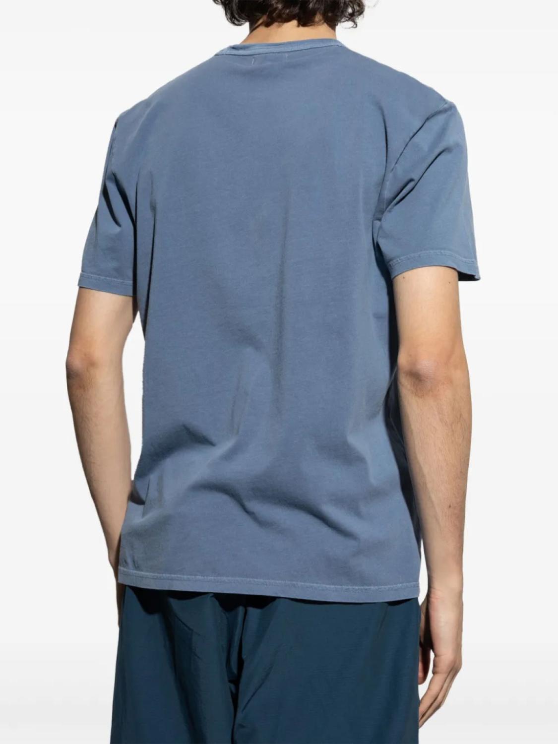 Светло-голубой круглый вырез, яркий принт с логотипом, свободный силуэт, короткие рукава, прямой подол, мягкая отделка