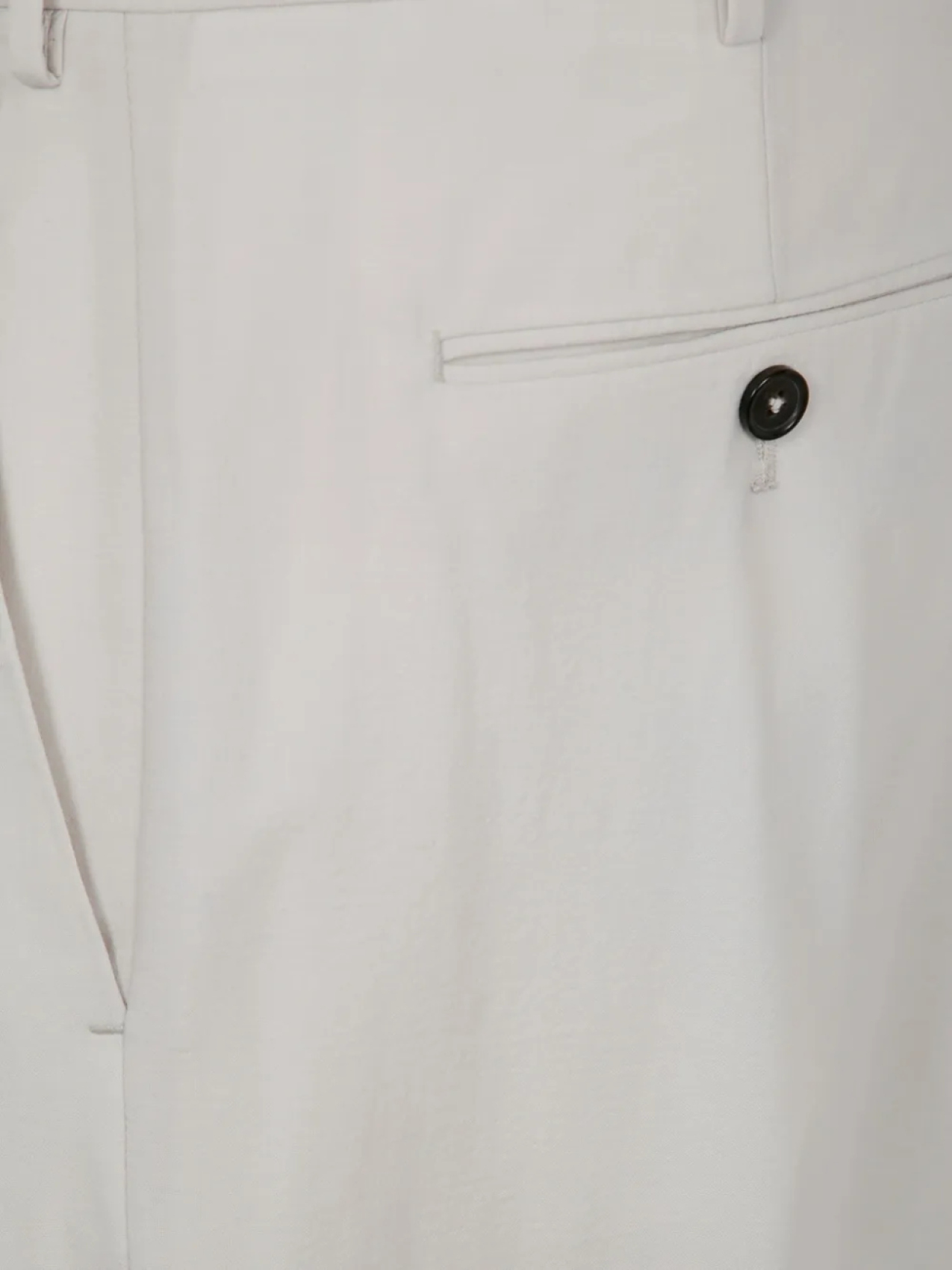 Светло-серая потайная застежка на пуговицы, два боковых прорезных кармана, застежка на пуговицу сзади, прорезной карман сзади, карман с клапаном