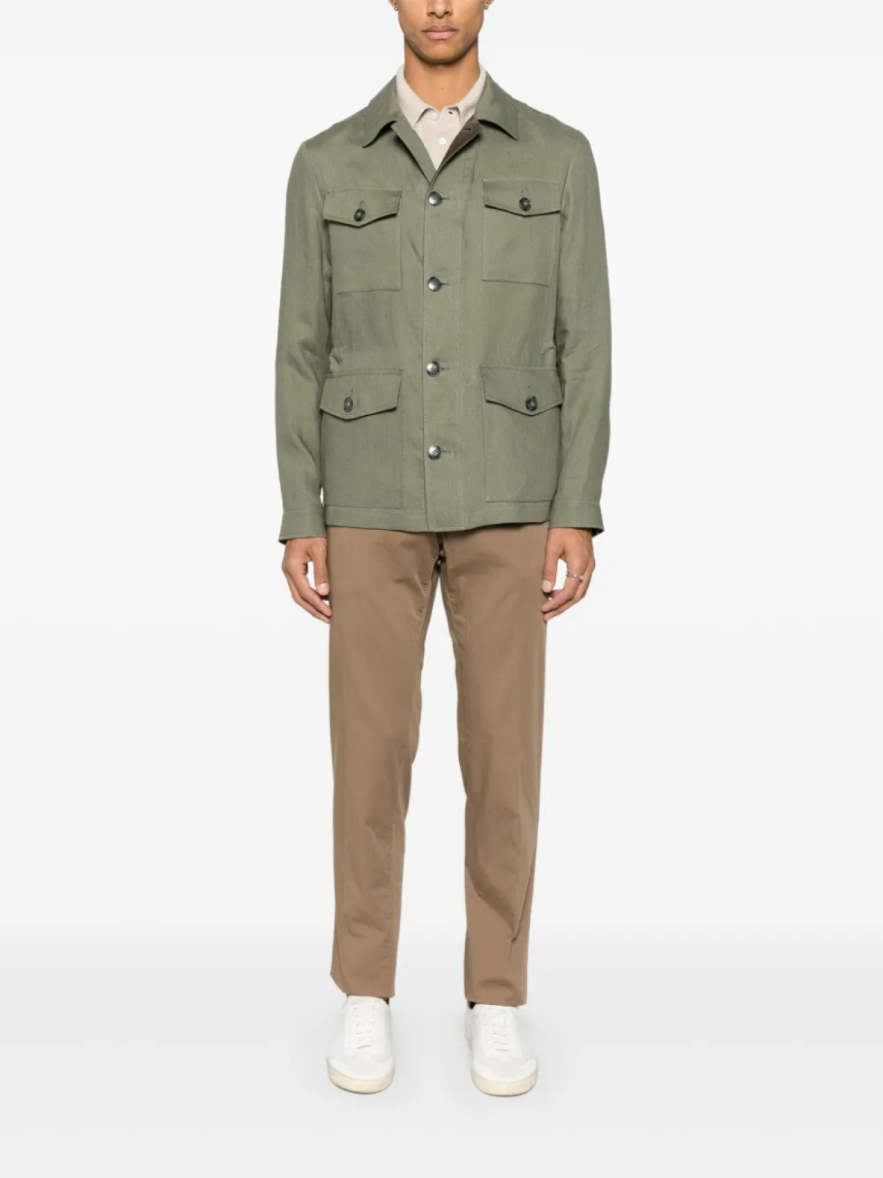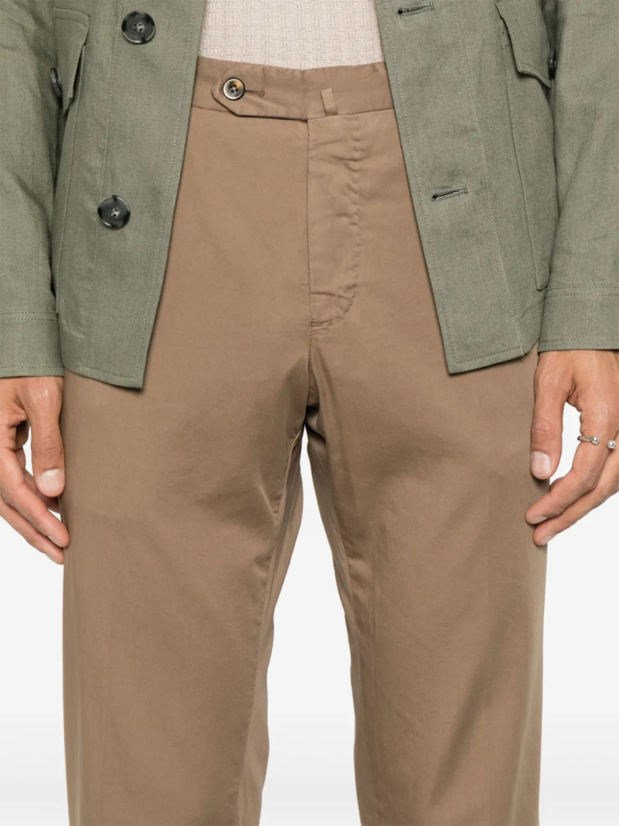 Оливково-коричневого цвета, застежка на пуговицы и молнию спереди, шлевки для ремня, два прорезных кармана по бокам, два прорезных кармана сзади на пуговицах