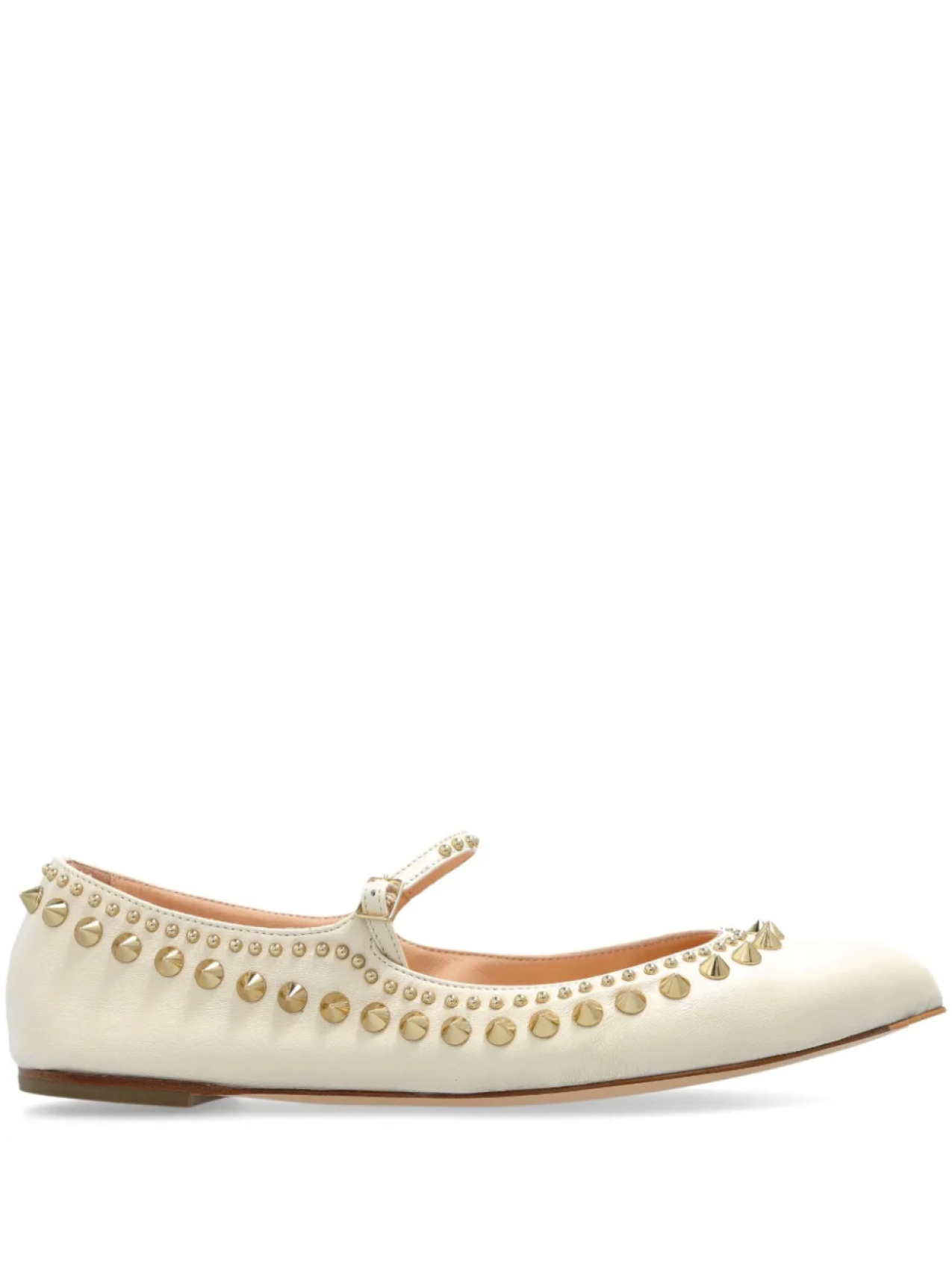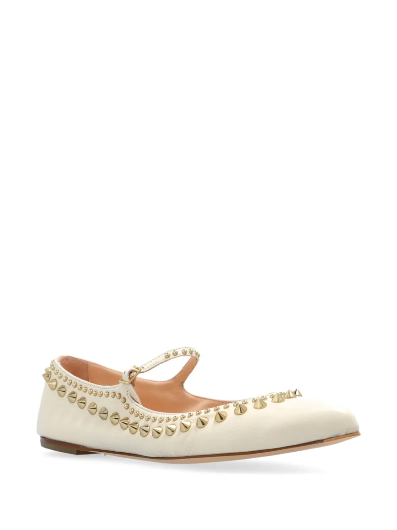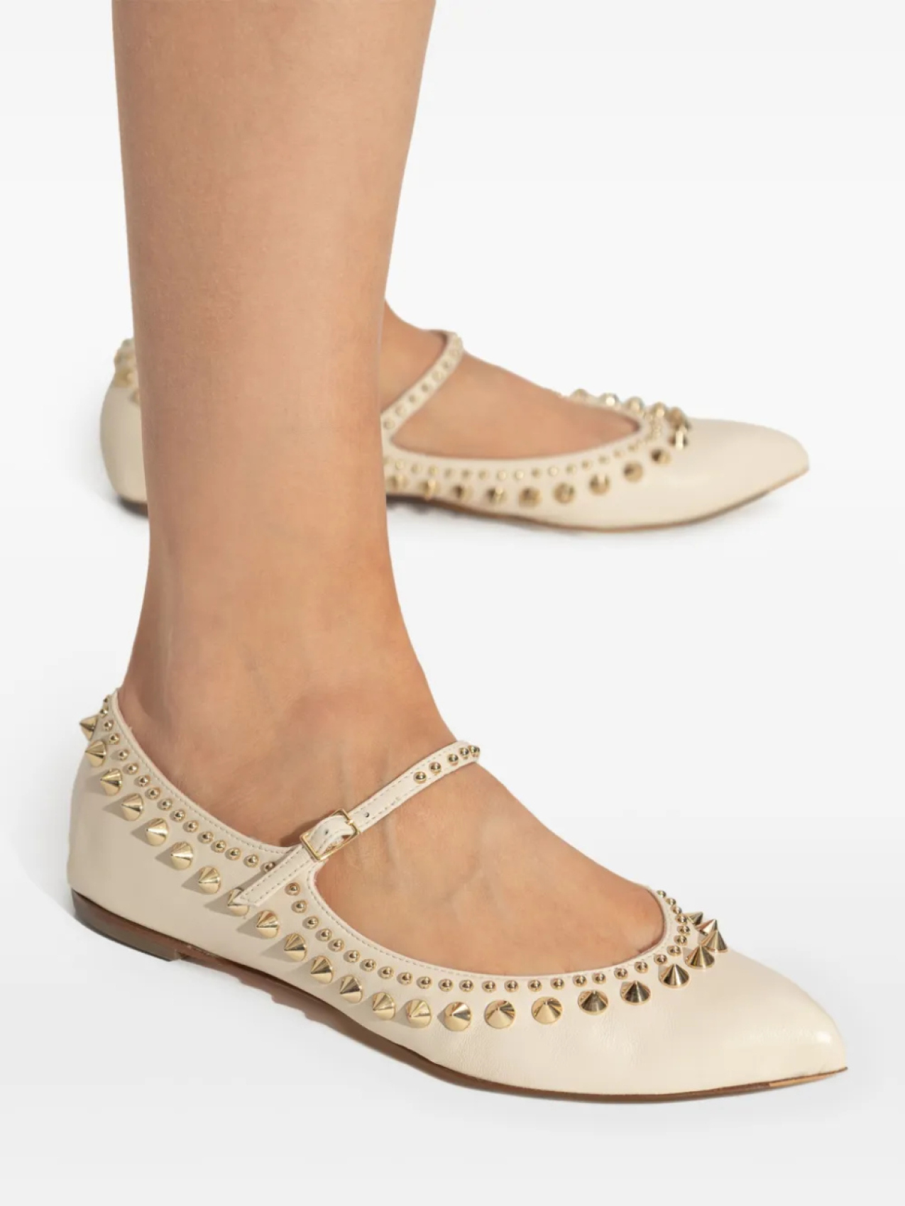 Миндалевидный носок цвета слоновой кости, декоративный элемент из заклепок, регулируемая застежка на пряжке, низкопрофильная подошва, гладкий силуэт, удобная стелька