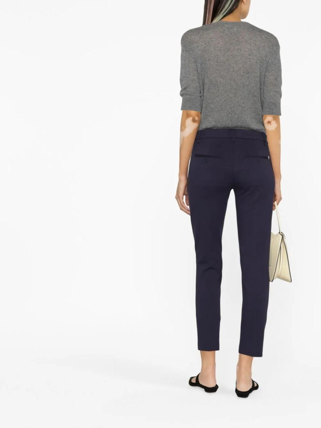 Темно-синий, средняя посадка, узкий крой, петли для ремня, потайная застежка спереди, прорезной карман спереди и укороченная длина.