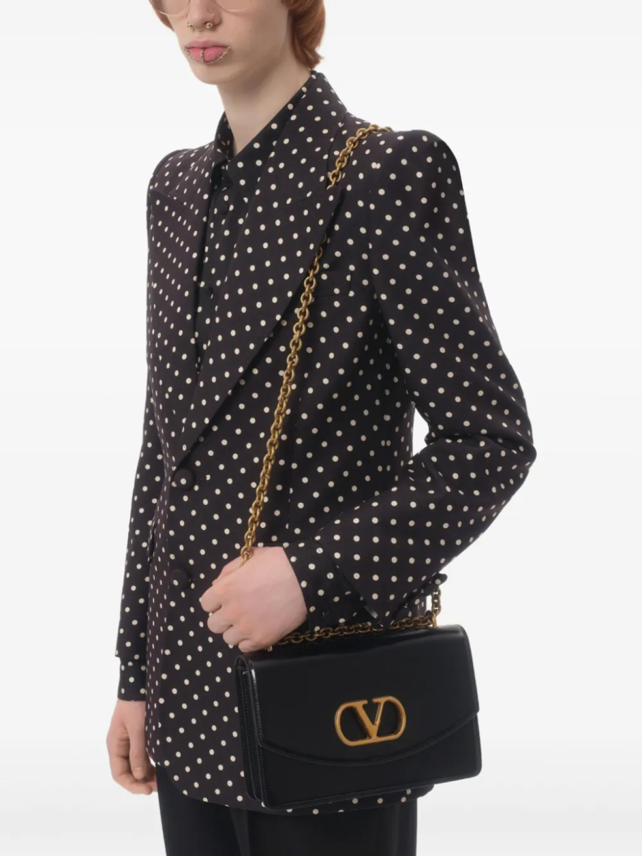 Готовый к носке пиджак Valentino Ready To Wear черного цвета с застежкой на пуговицы спереди и манжетами на пуговицах. Полный образ включает аксессуары Valentino Garavani.
