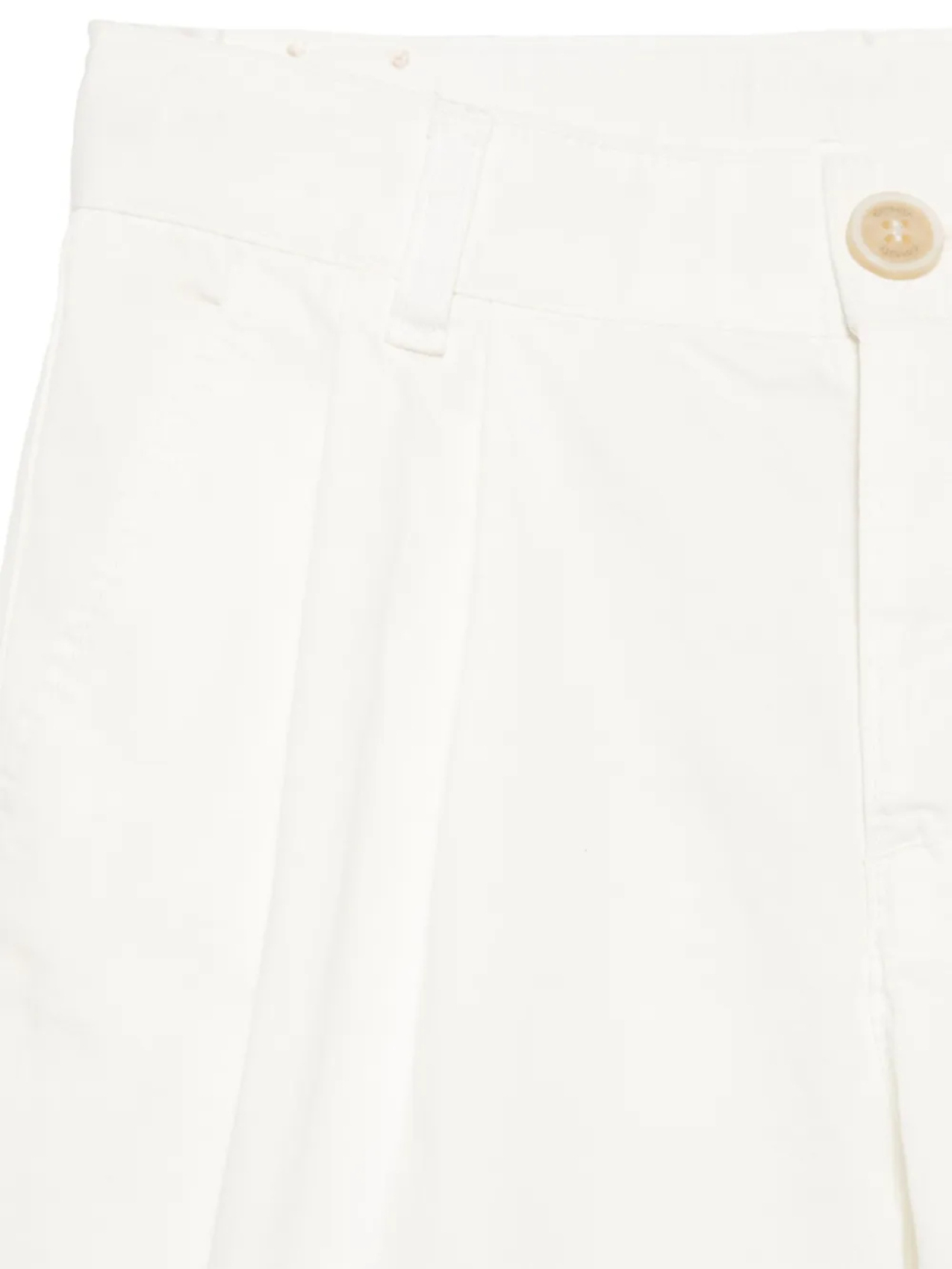Белая потайная застежка на пуговицы и ширинку, шлевки для ремня, два диагональных кармана по бокам, два кармана с клапанами сзади