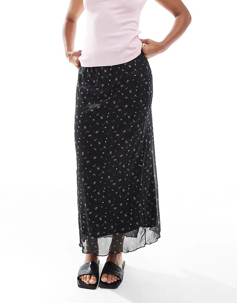 Юбка макси с салатовым краем в черный мелкий рисунок ONLY