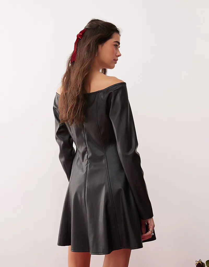 Мини-платье-бардо из искусственной кожи с клешем Miss Selfridge