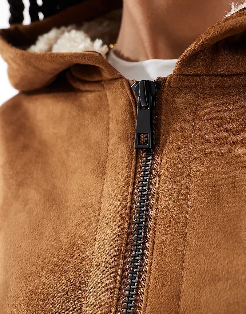 Куртка из овчины с капюшоном в коричневом цвете ASOS