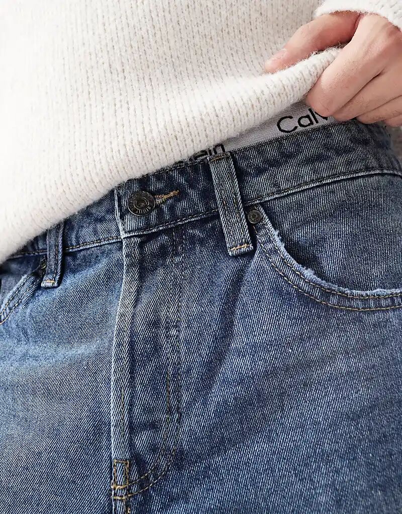 Неэластичный деним: средне-голубой цвет. Основная часть: 79% хлопок, 21% полиэстер.