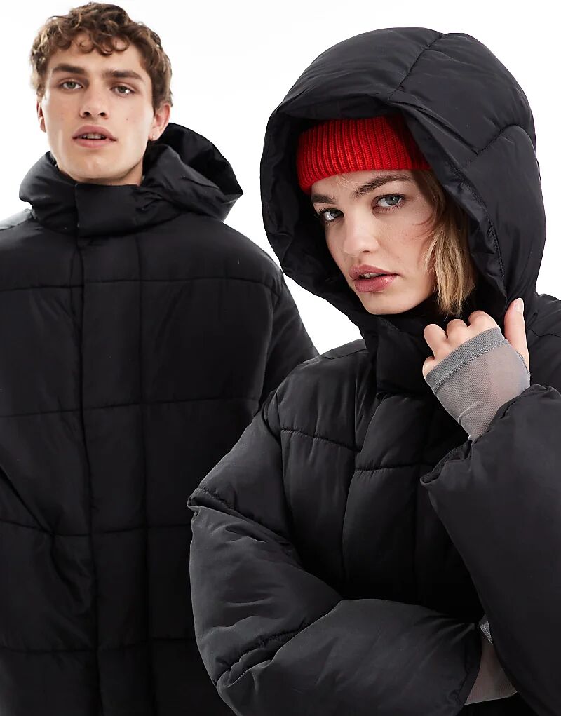 COLLUSION Унисекс макси-пуховик с капюшоном черного цвета