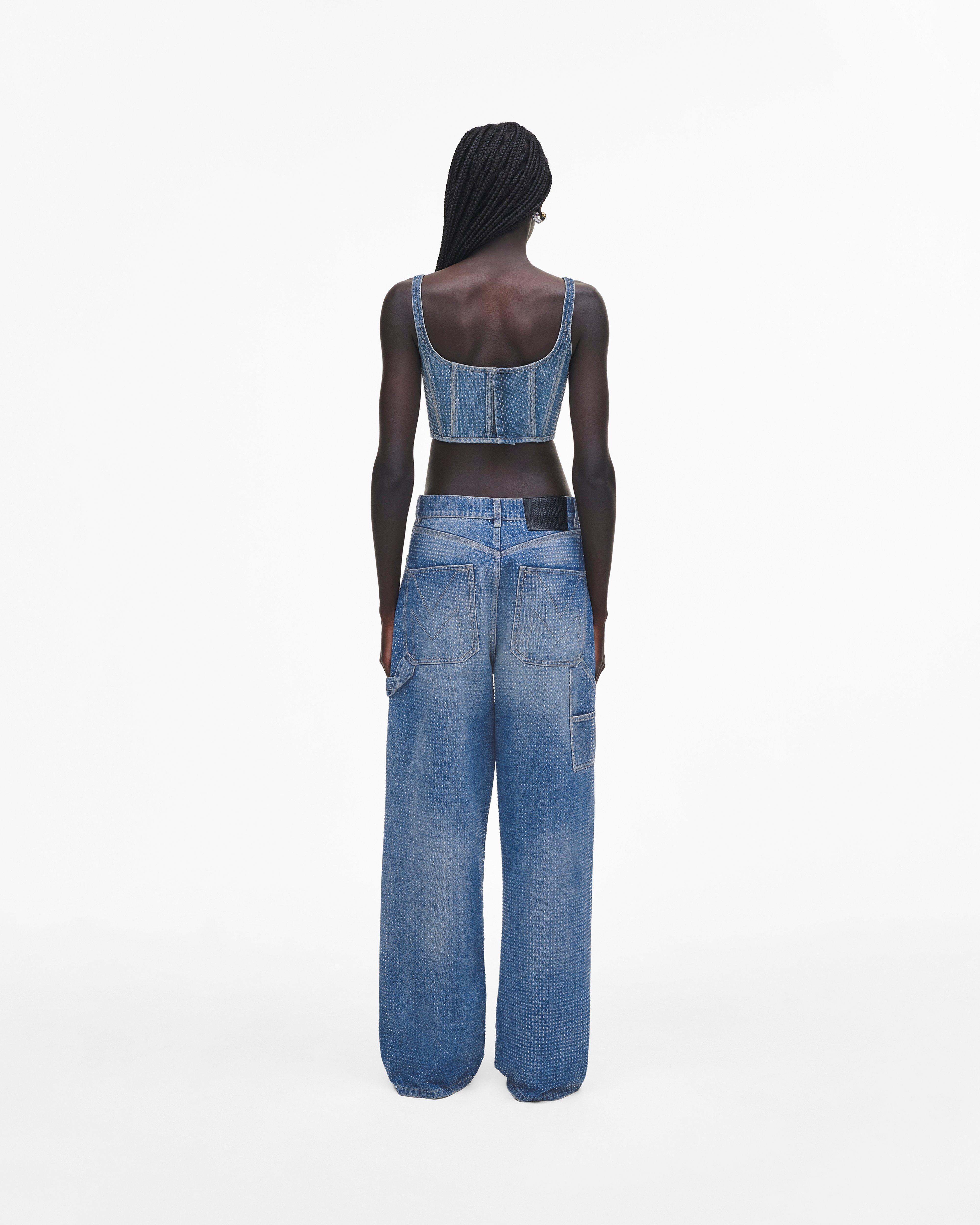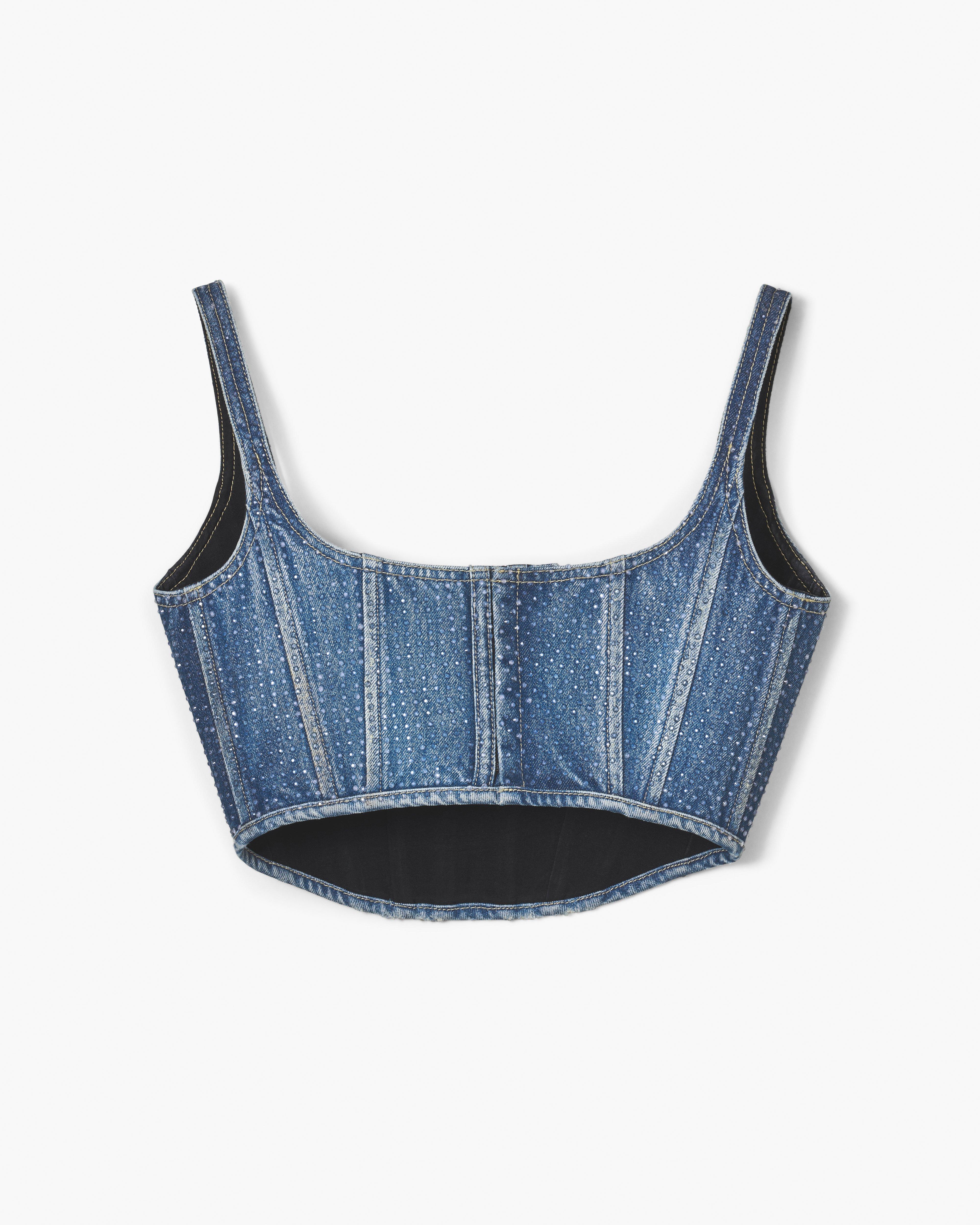 Фирменный подиумный корсет Марка переосмыслен в дениме, украшенном кристаллами. Сочетайте с сезонными вещами, чтобы завершить образ.