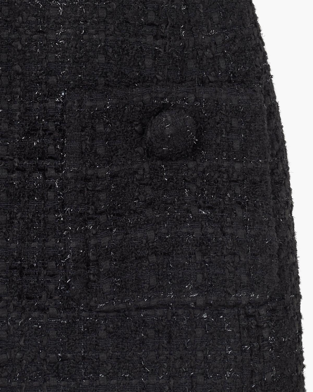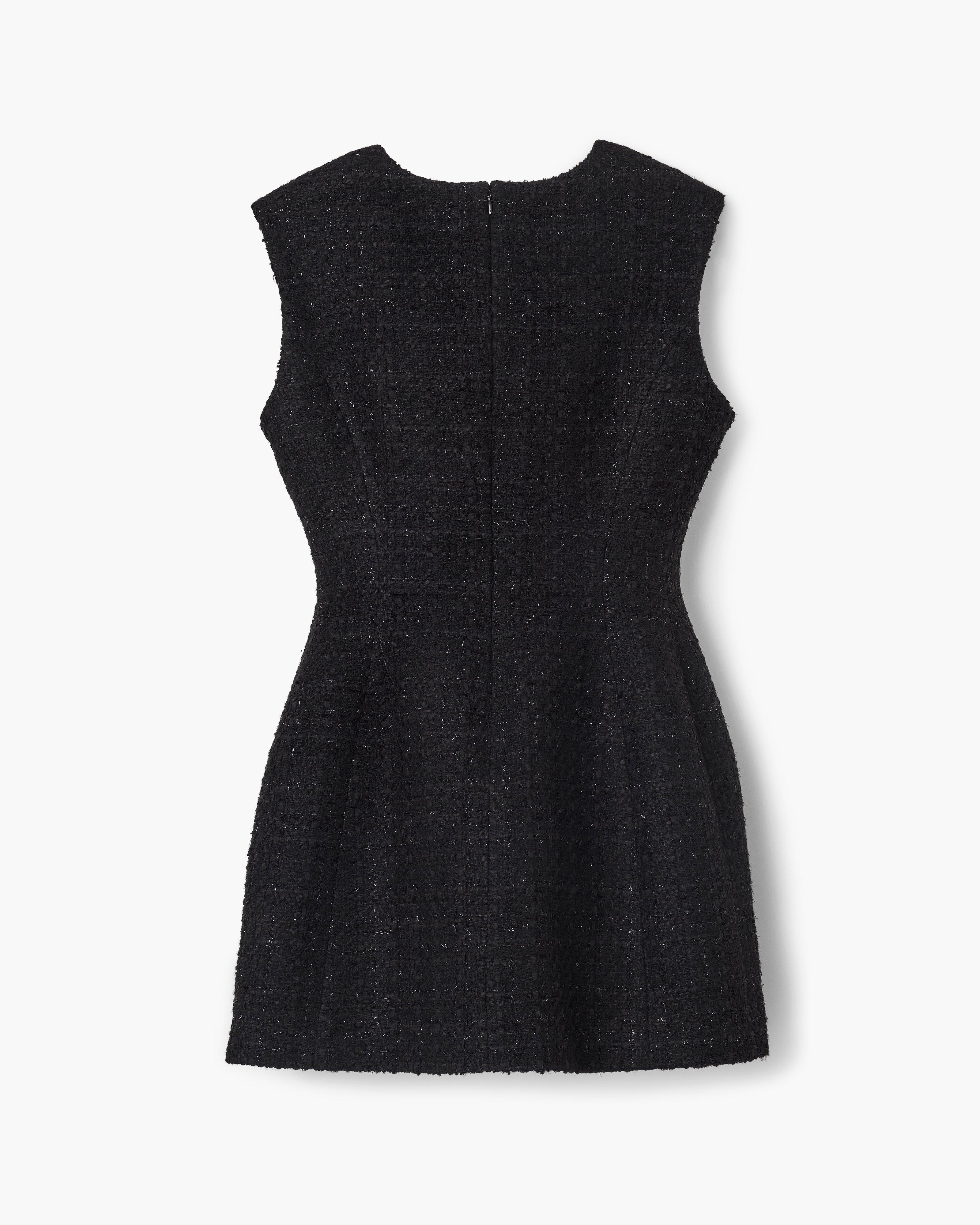 Вдохновленное кукольными пропорциями подиума FalL'24, скульптурное твидовое платье охватывает особенно женственный силуэт с этим коротким маленьким черным платьем. С подиумным вдохновленным высоким круглым вырезом, классической текстурной твидовой тканью и подплечниками для структурированного образа, это повседневное и вечернее базовое изделие включает два передних кармана с твидовыми пуговицами в форме полукупола и легкую застежку-молнию сзади.