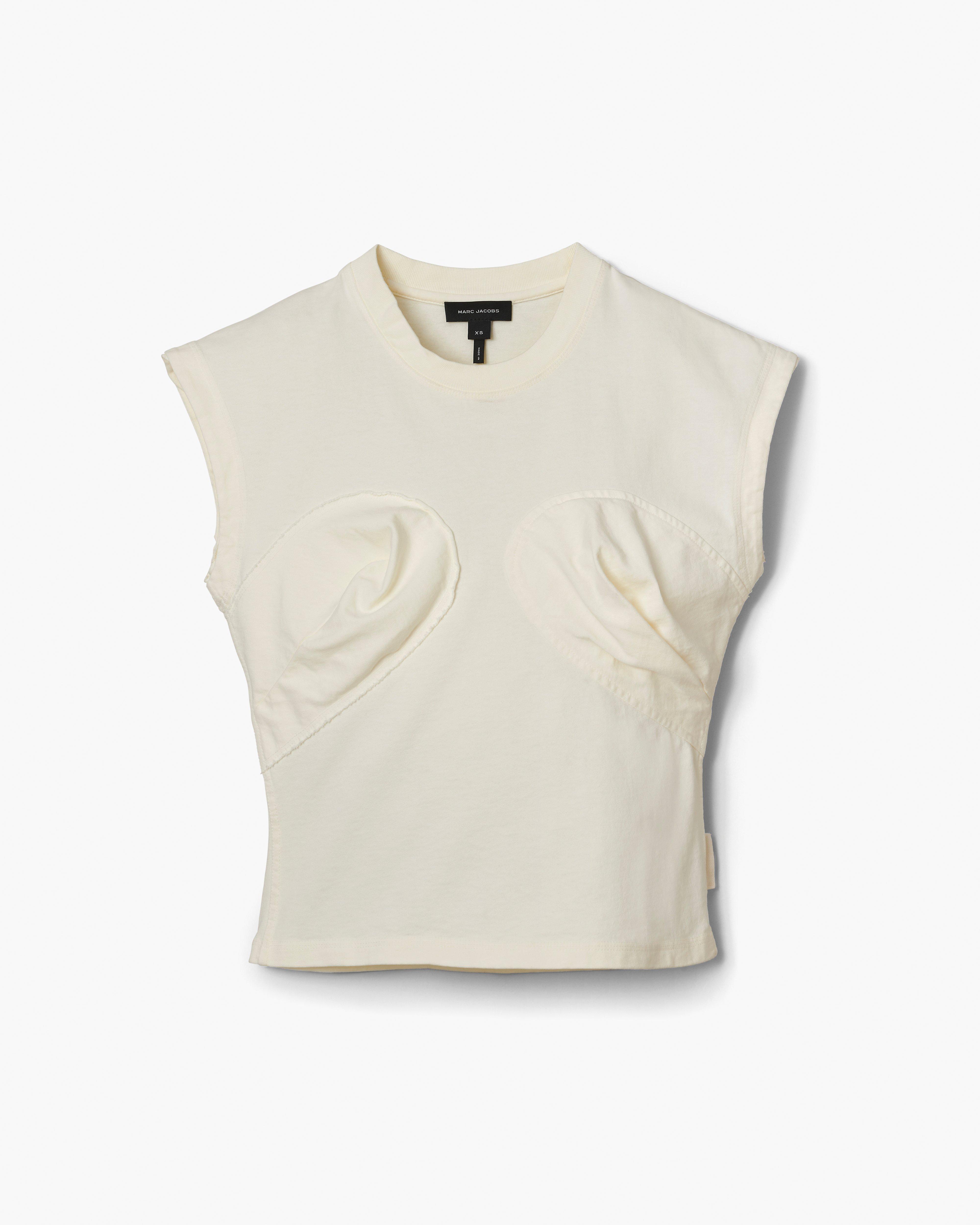 Подиум для реального момента. Эта футболка из джерси и хлопка имеет форму, вдохновленную футболкой для мускулистых спортсменов, и украшена пришитыми аппликациями на груди.