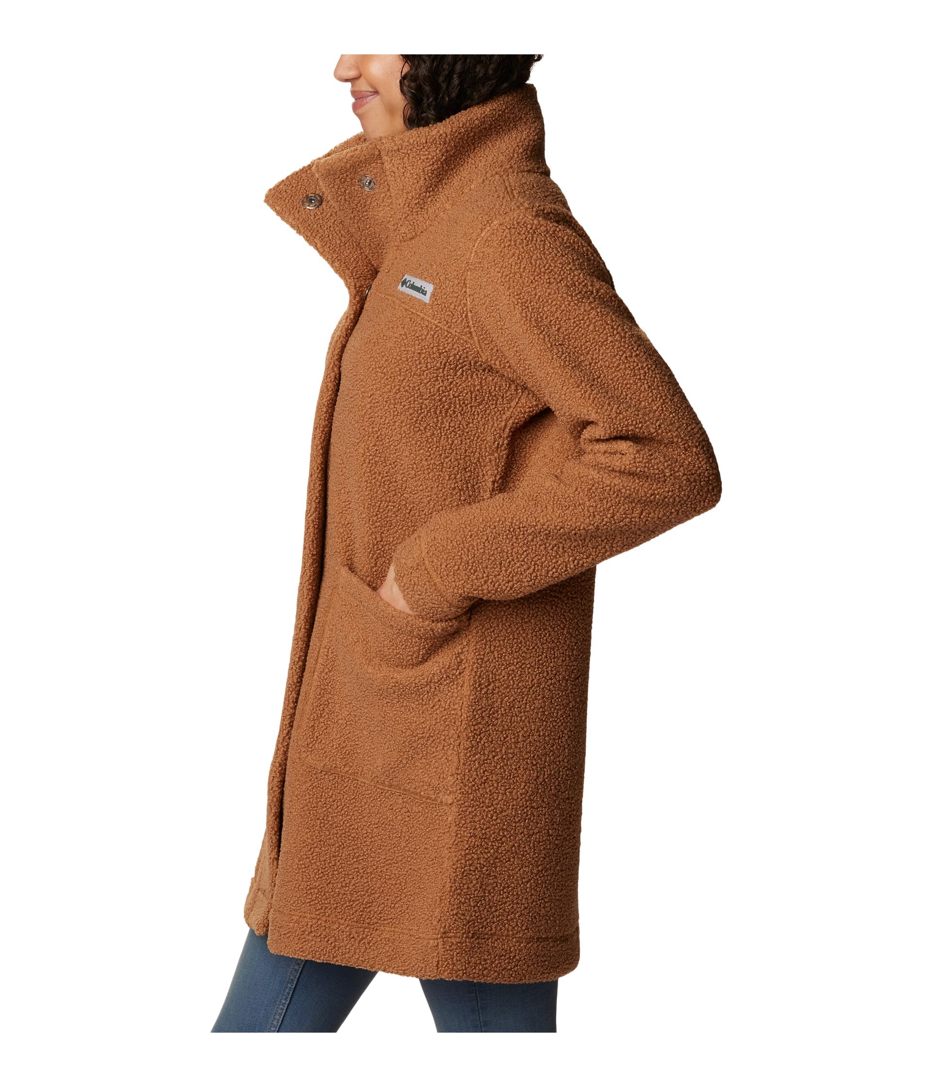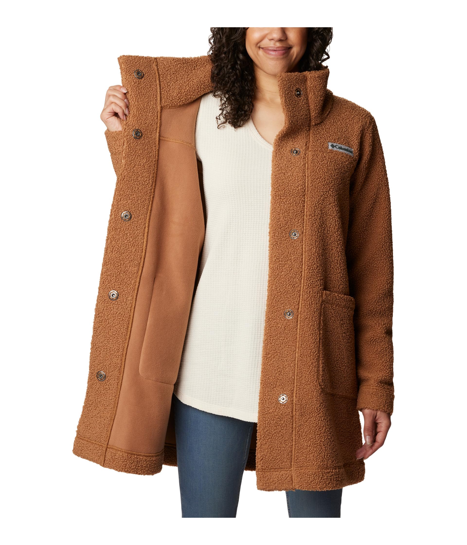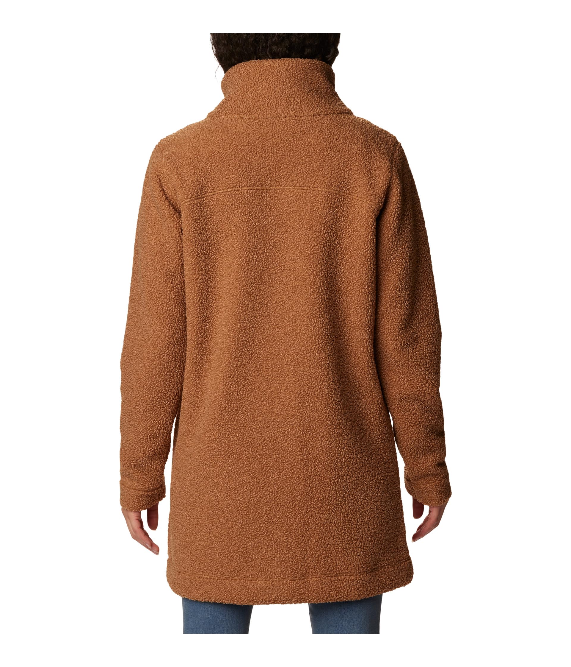 Сверхмягкая флисовая ткань с высоким ворсом имеет воротник-стойку, застежку на пуговицы спереди, длинные рукава и прорезные карманы для рук.
