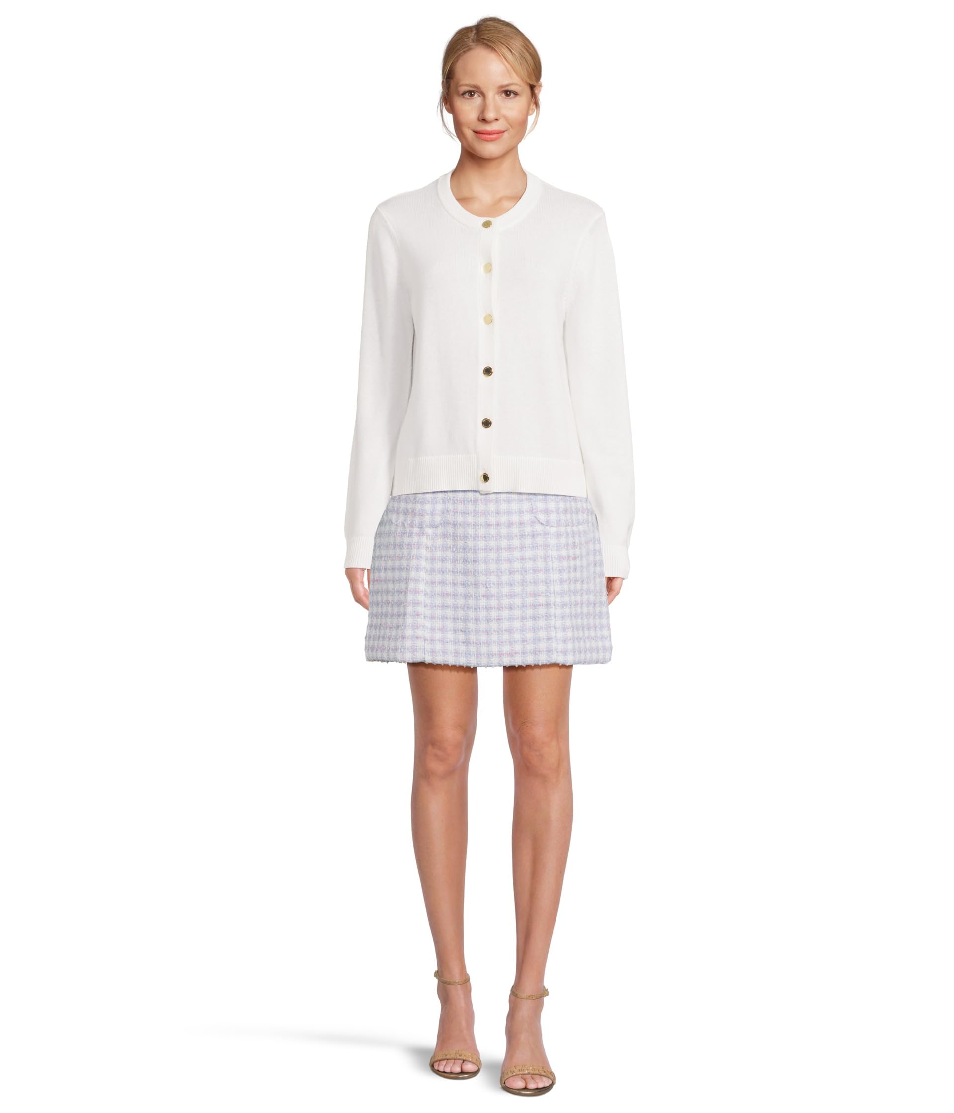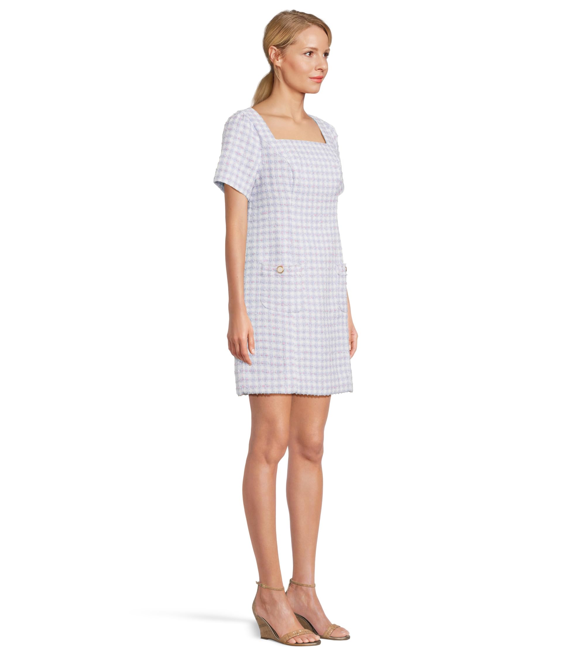 Ваша простота и изящество заставят обернуться всех на следующем мероприятии, когда вы наденете платье-футляр Lilly Pulitzer Gwynne Boucle. Платье-футляр с застежкой-молнией имеет квадратный вырез, короткие рукава, два накладных кармана с пуговицами спереди, клетчатый принт по всей поверхности и силуэт выше колена.