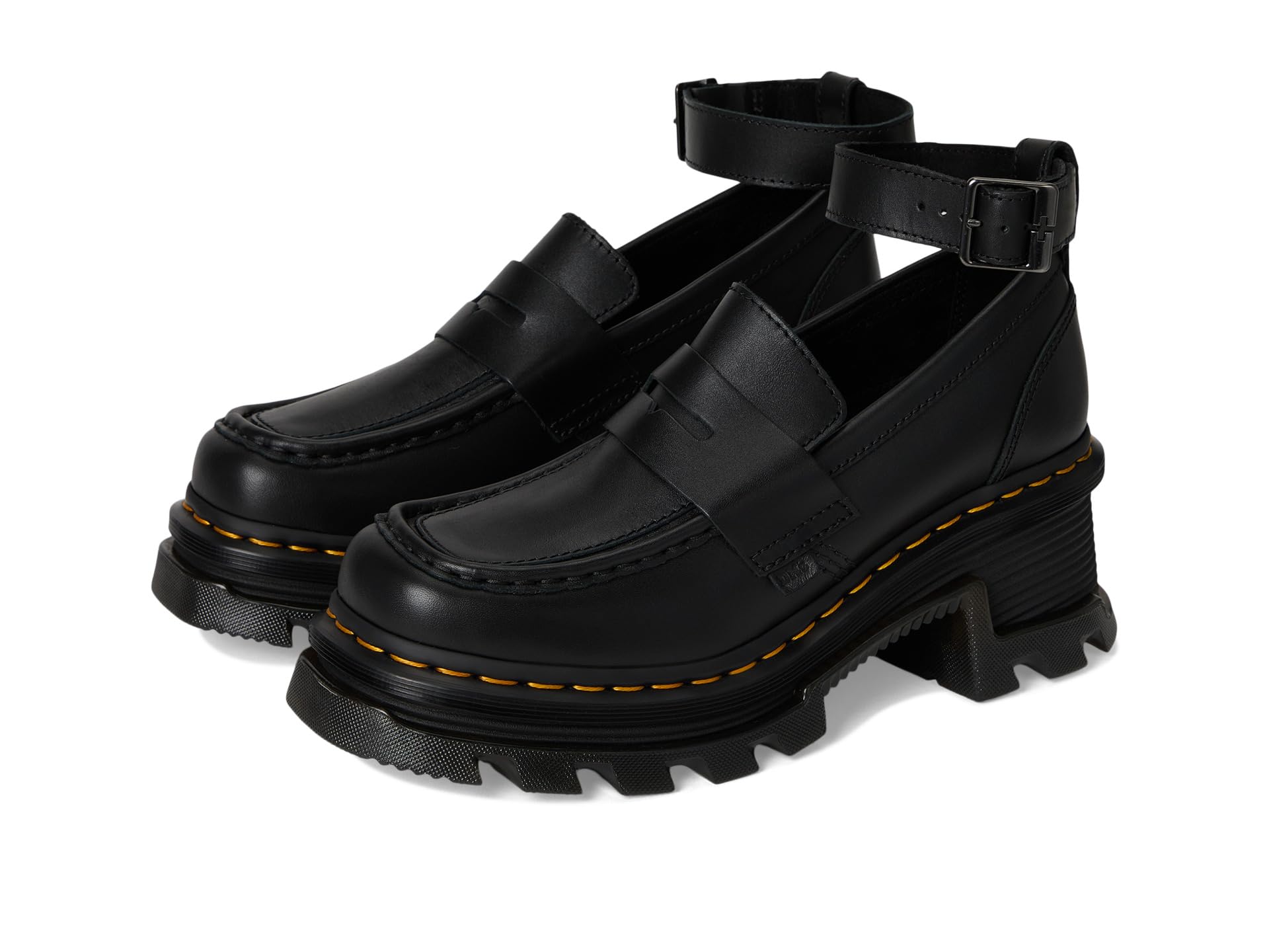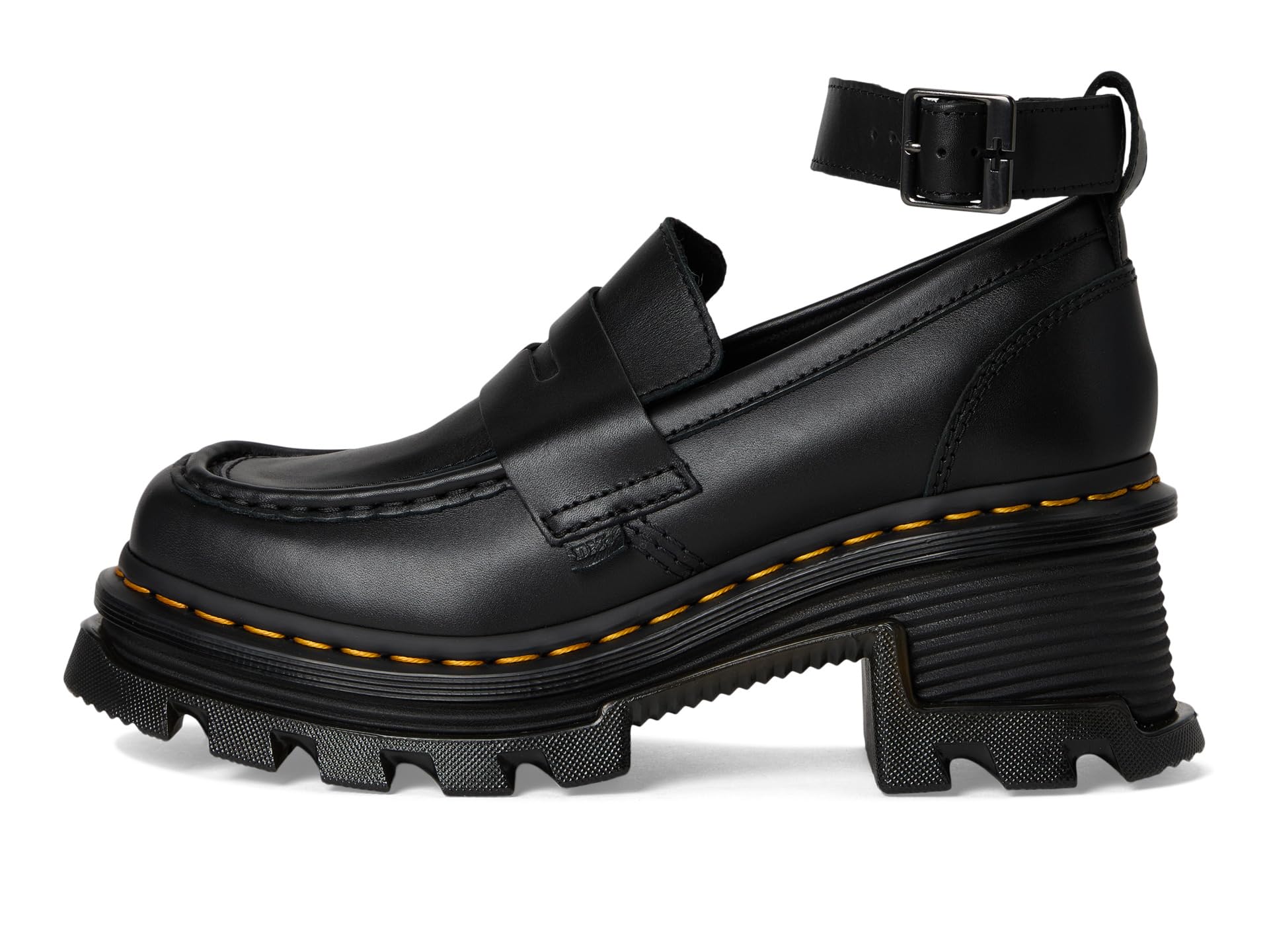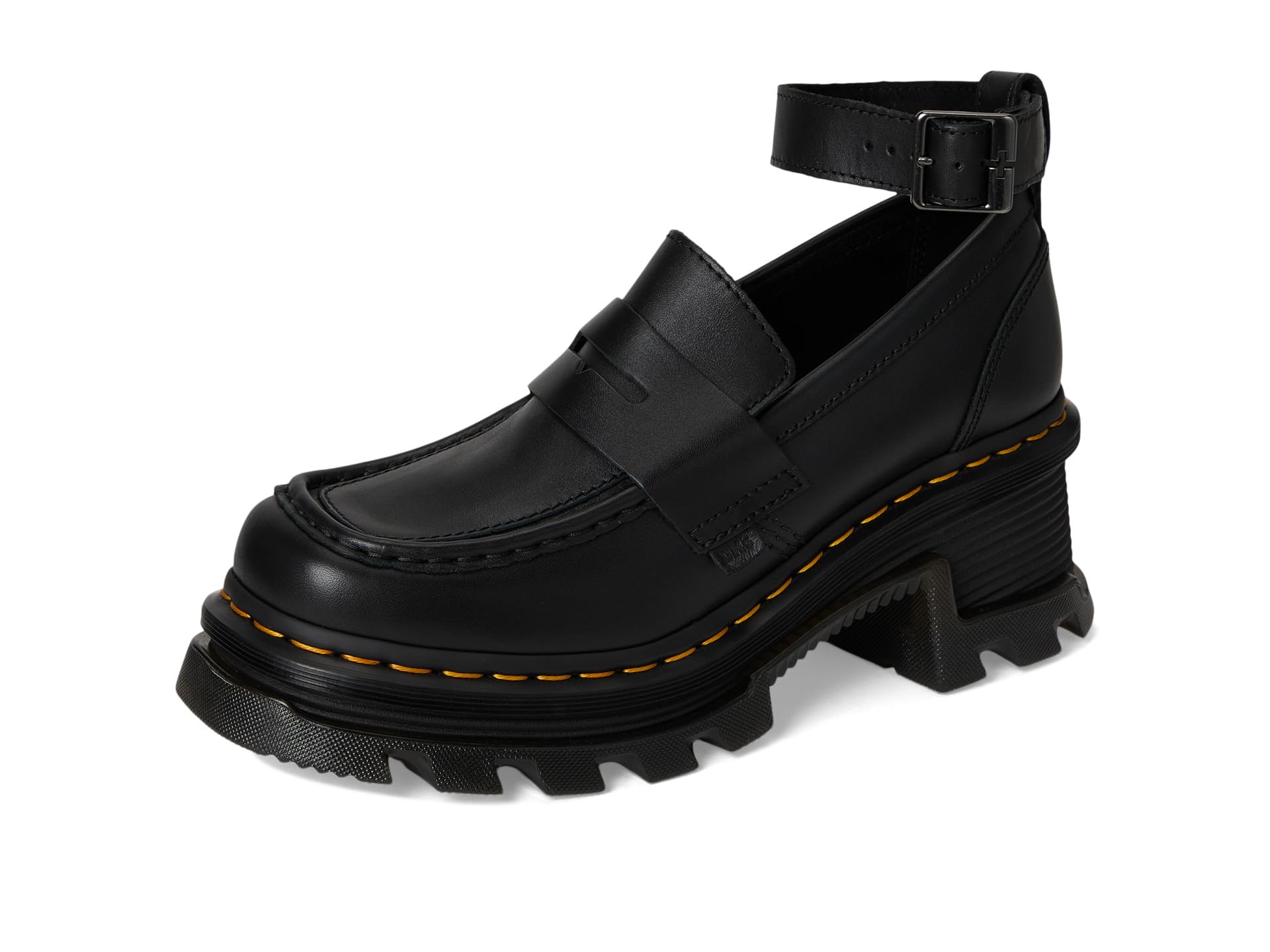 Лоферы Dr. Martens Corran Loafer стоят на эффектной подошве Dr. Martens, отмеченной преувеличенными канавками, глубокими шипами и фирменной желтой строчкой DM. Кожаный ремешок на щиколотке украшен тиснением с фирменным знаком DM и оснащен регулируемой пряжкой. Верх, подкладка и стелька выполнены из кожи.