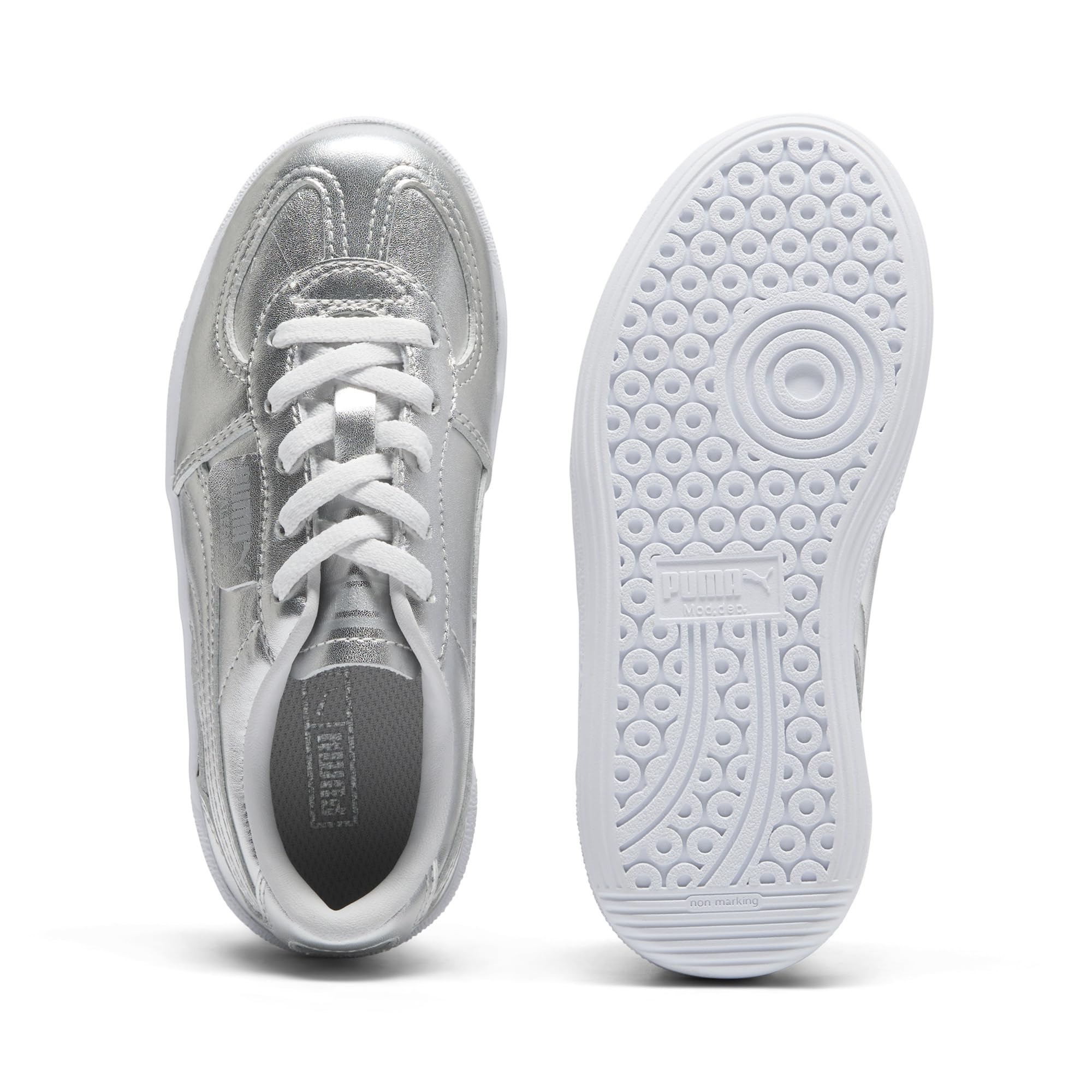 Идеально подходит как для молодых любителей кроссовок, так и для знатоков моды на террасе, PUMA Kids Palermo Chrome. Прямо из архивов, эта классическая обувь для террасы может похвастаться фирменной конструкцией T-toe и смелой цветовой блокировкой, обновленной для современных законодателей моды. Изготовленная с верхом из ЭВА и подкладкой из полиэстера, она обещает легкий комфорт и воздухопроницаемость при каждом шаге. Резиновая стелька обеспечивает амортизирующую поддержку, а подошва из ЭВА обеспечивает прочность и сцепление для игры в течение всего дня. В комплекте со шнуровкой и круглым носком, она сочетает в себе традиционный футбольный стиль с современным стилем.