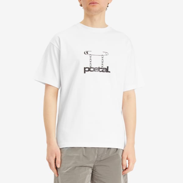 Футболка POSTAL, название которой висит на цепочке с булавкой, — явный символ бунта и анархии, передающий дух бренда. Известный смелыми, часто анархичными дизайнами, POSTAL — это не только мода; логотип служит напоминанием о том, что графика — это не просто визуальные эффекты, это призыв к индивидуальности.
