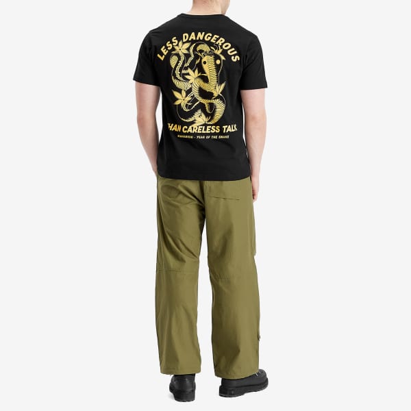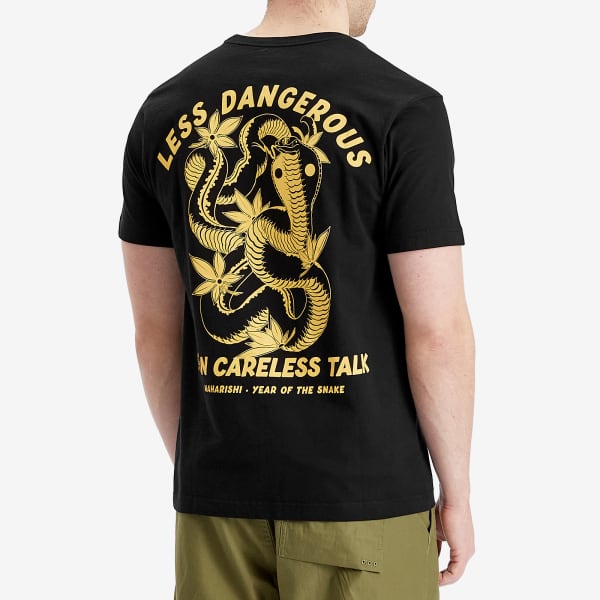 Униформа для повседневной жизни, последняя коллекция Maharshi является отражением глубокой признательности ее основателя Харди Блехмана за военный пацифизм и дизайн «Восток встречается с Западом», отмечая «Год Змеи» с этой новой сезонной футболкой Less Dangerous. На ней доминирует смелый мотив кобры, напечатанный на спине, а также слоган времен Второй мировой войны, завершенный брендингом Maharishi на груди.