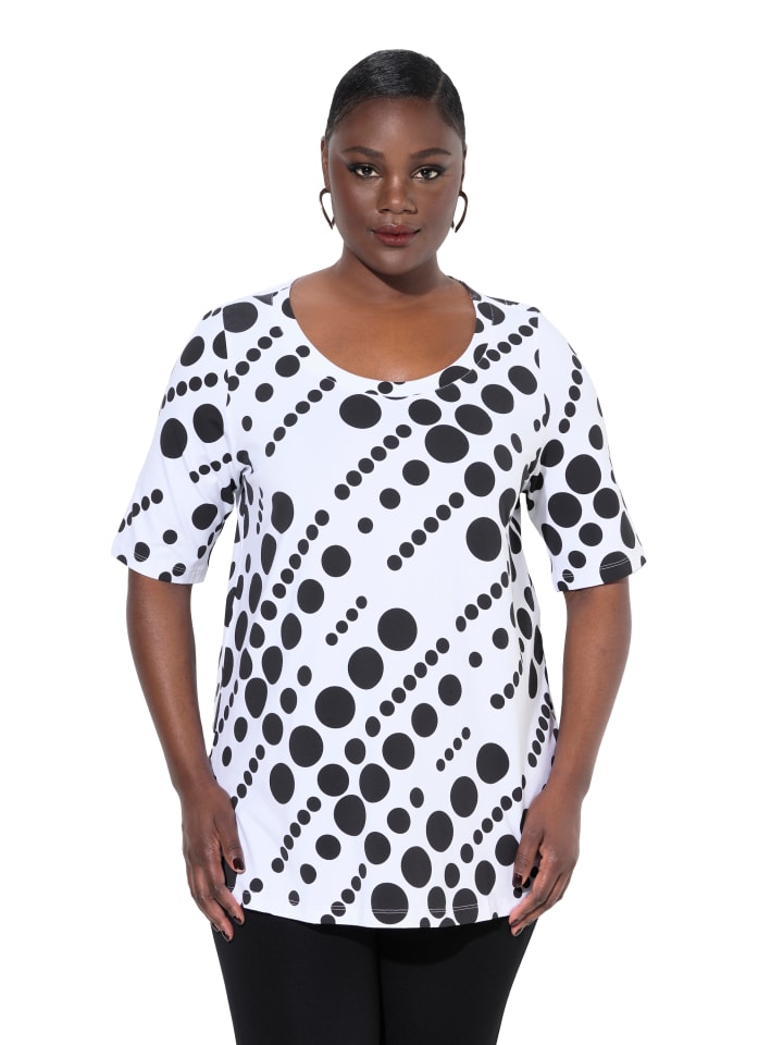 Футболка А-силуэта из высококачественного мягкого хлопкового трикотажа с современным графическим рисунком в горошек. Круглый вырез, полурукавки, боковые прорези для гладкого прилегания.материал