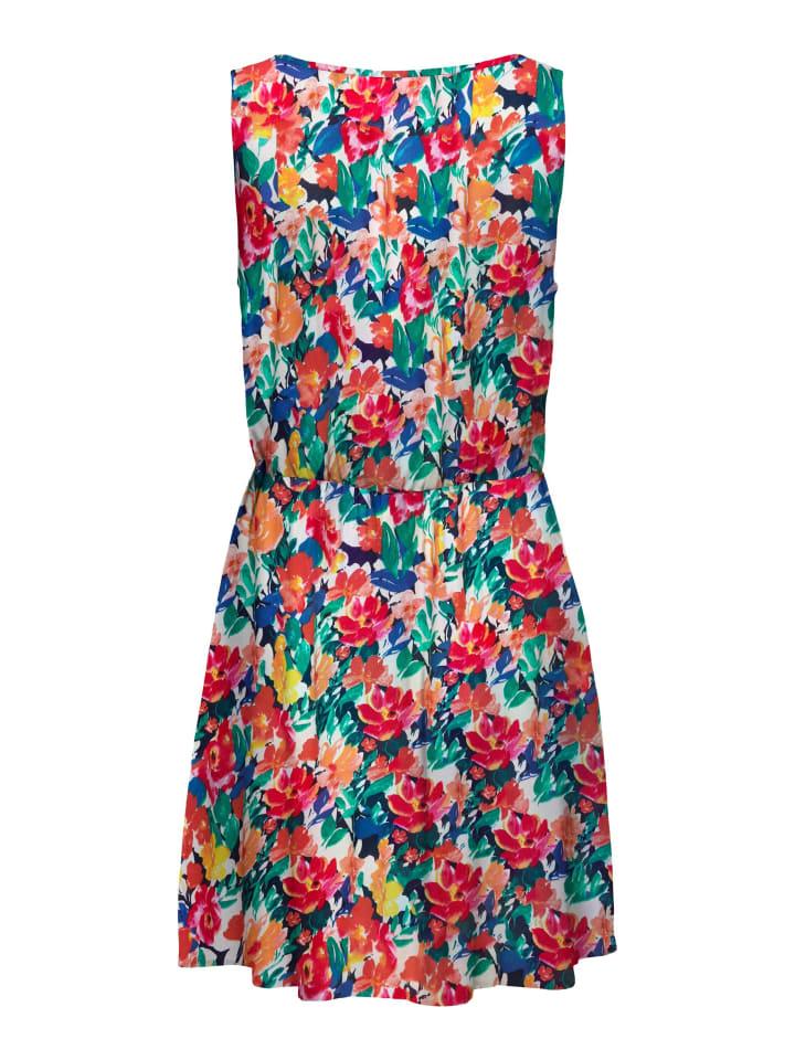 Мини-платье JDY 'Starr Life' бежевого цвета с ярким цветочным принтом, многослойным принтом, короткое платье в цветочек / цветочек, обычного кроя, с круглым вырезом, с завязками на талии, тканый материал