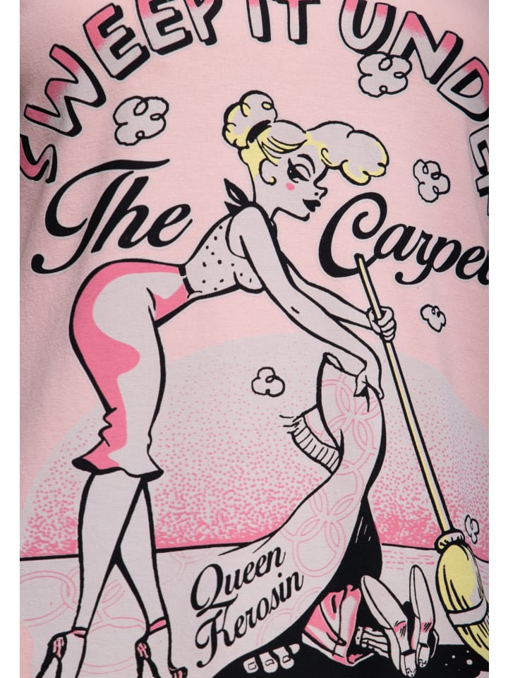 Эта футболка Queen Kerosine с юмористическим дизайном "Убери это под ковер" создает привлекательный ретро-образ, который гарантированно станет предметом разговора. Привлекательный V-образный вырез и женственная приталенная посадка идеально дополняют общий образ. Футболка, изготовленная из высококачественной смеси хлопка и эластана, обеспечивает не только первоклассный комфорт при ношении, но и отличную стабильность формы. С этой рубашкой вы привнесете стиль и веселье в свой образ!