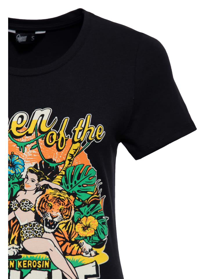 С этим топом вы станете бесспорной королевой дикой природы! Футболка Queen Kerosin привносит в вашу повседневную жизнь атмосферу приключений и тропического ретро благодаря своему выразительному дизайну. Классический вырез с круглым вырезом и женственная приталенная посадка обеспечивают оптимальную посадку. Рубашка, изготовленная из высококачественной смеси хлопка и эластана, обеспечивает не только первоклассный комфорт при ношении, но и долговечность. Придайте своему образу очарование 50-х и дикий колорит джунглей!