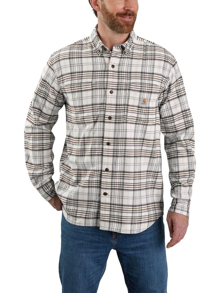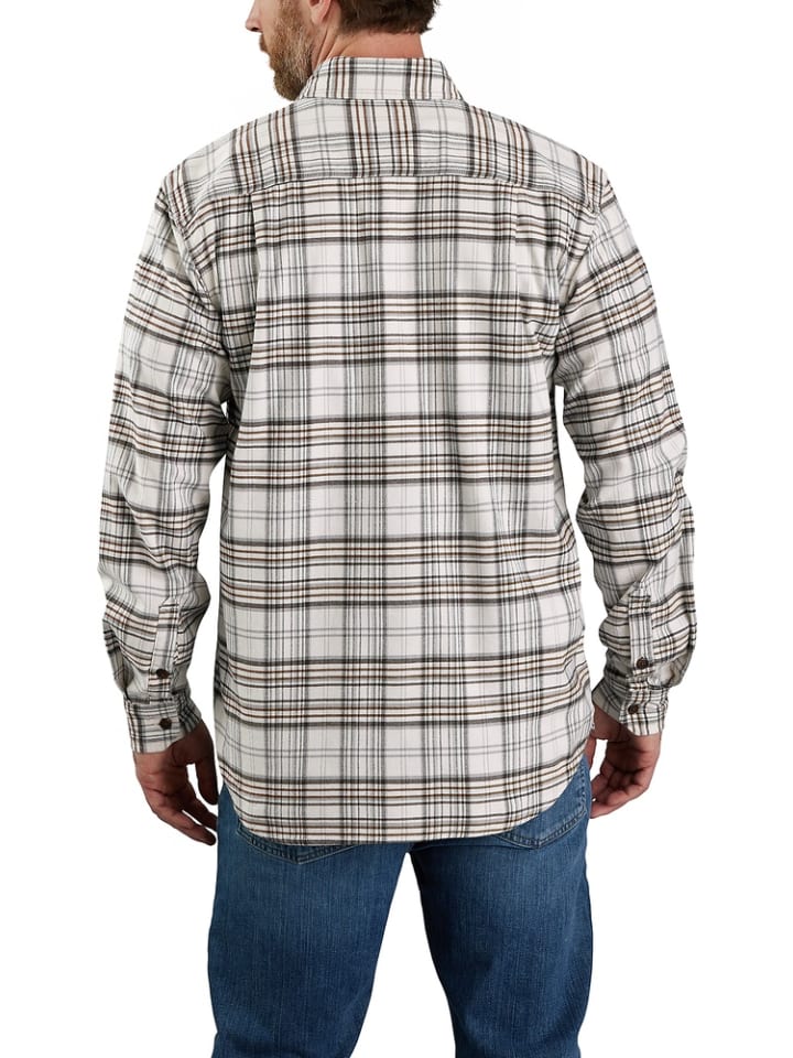 Рубашка-стрейч в клетку с длинными рукавами; Свободный крой; 5,6 унций/ярд² - 190 г/м²; 97% хлопок/3% эластан; Фланель с эластаном; Rugged Flex — облегчает движение; Воротник-стойка из двух частей; Длинные рукава; Два нагрудных кармана, левый нагрудный карман с отверстием для карандаша и дополнительным отделением для хранения вещей; Застежка на пуговицы спереди; Регулируемые манжеты с двумя пуговицами и длинными разрезами; Тройной простеганный основной шов