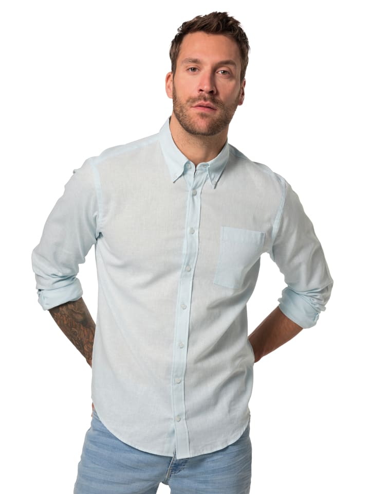 Рубашка из льняной смеси с длинным рукавом, выполнена из прохладной льняной смеси, имеет воротник на пуговицах и нагрудный карман. Также можно носить поверх брюк. Материалы