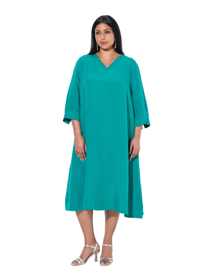 Льняное платье-миди А-силуэта из льняной смеси, естественно прохладное и плавно ниспадающее, из льняной смеси. Тщательно стеганый V-образный вырез. рукава 3/4 с разрезом, карманы по бокам.материал