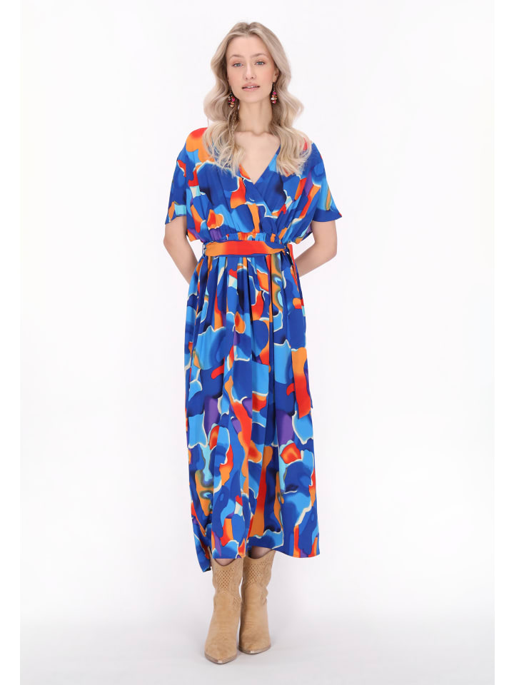 A stunning wrap dress designed for a relaxed fit. A V-neckline and short sleeves create a flattering silhouette, while a slim waist with a belt accentuates the shape. Made of fabric adorned with an abstract print, this midi dress is perfect for casual boho-inspired looks. It is part of the Spring Summer Collection.