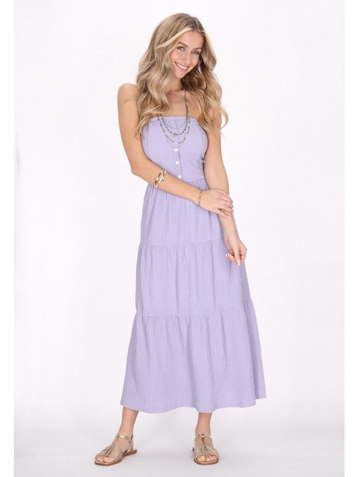 Stylish off-the-shoulder maxi dress with a regular fit that accentuates any figure. The sleeveless design and ruffled hem create a fun vibe, while the woven fabric ensures comfort. Fastened at the front with buttons, it is ideal for everyday wear on warm days. It is part of the Spring Summer Collection.